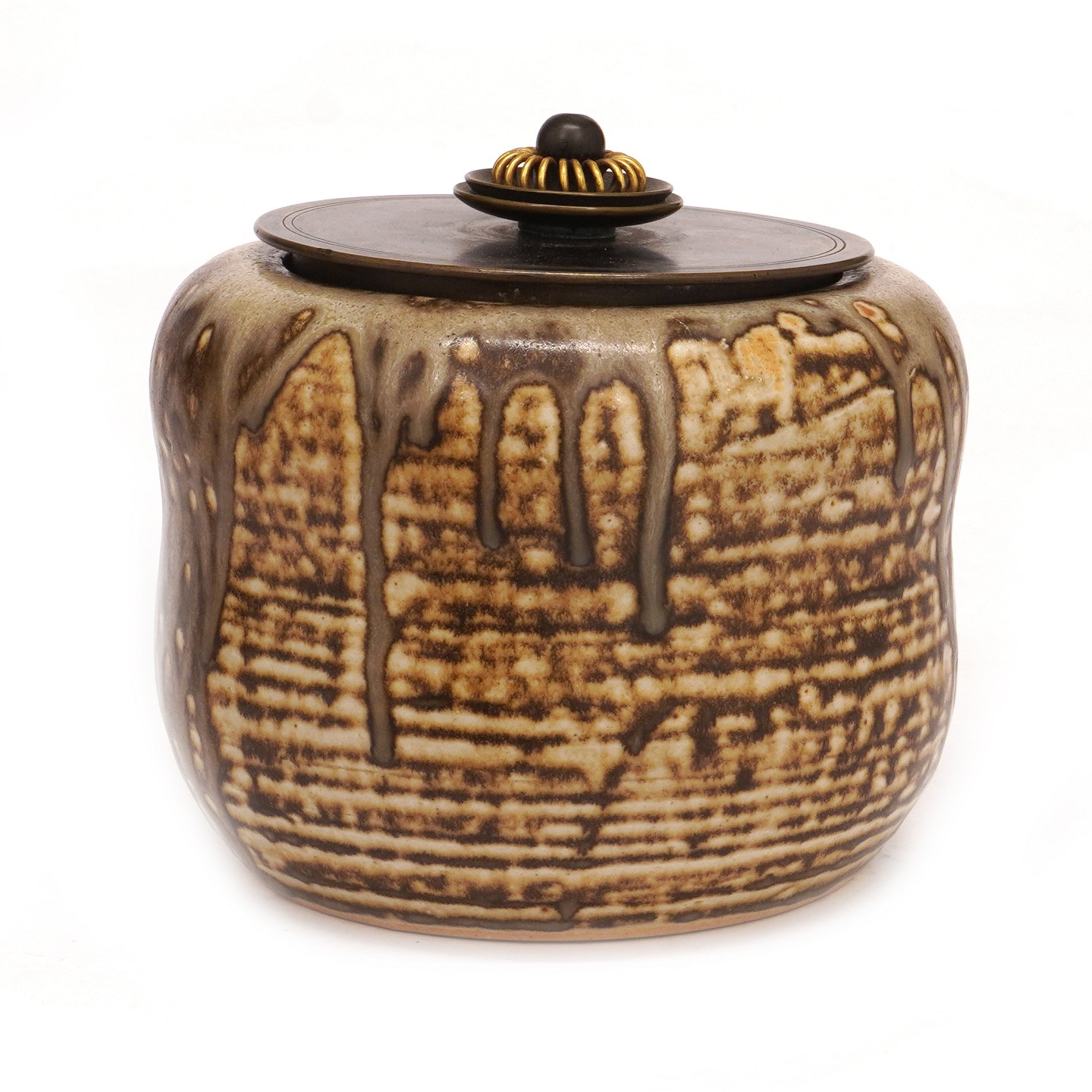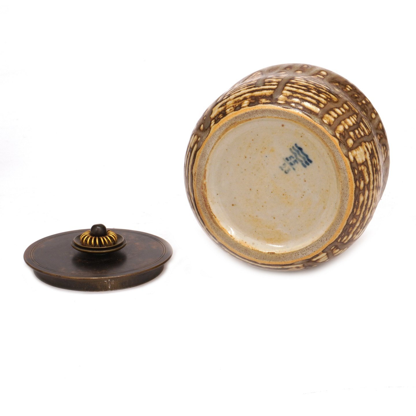 Carl Halier tilskr., Royal Copenhagen, lågkrukke af stentøj med bronzelåg