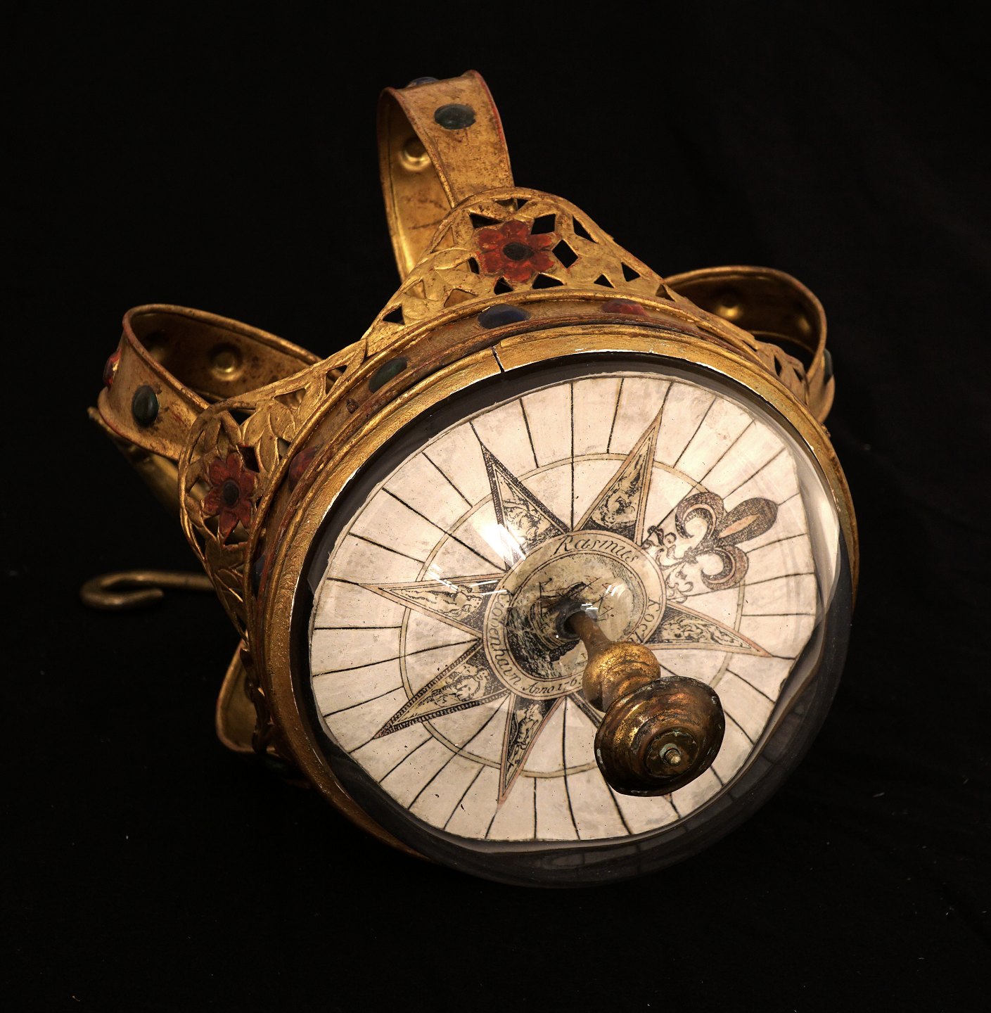 Sladrekompas med forgyldt krone. Signerert: "Rasmus Koch anno 1765". H: 43cm m ophæng. Kompas: 25x26cm