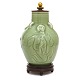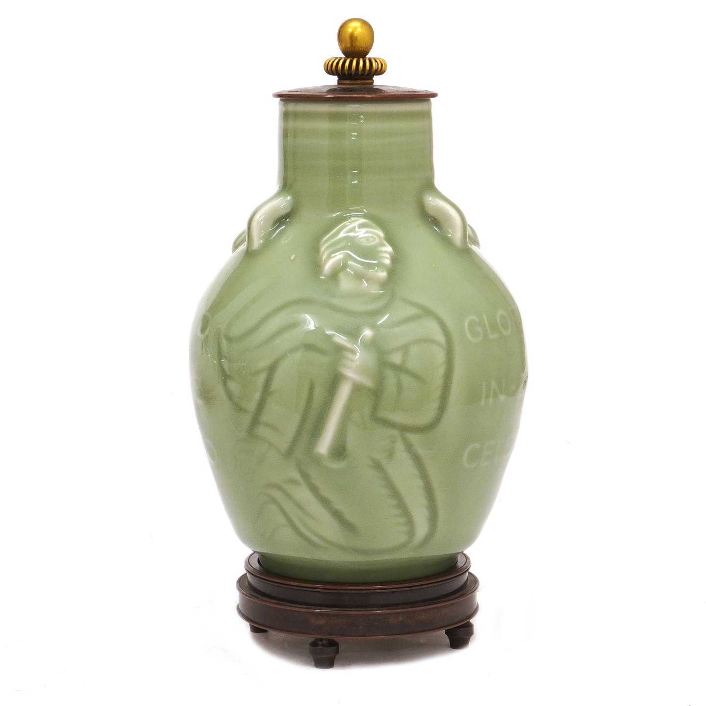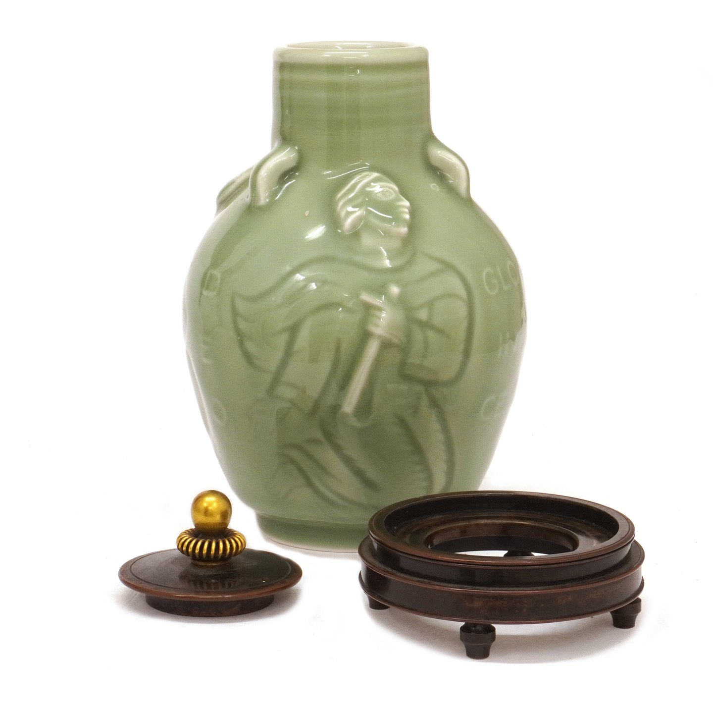 Jais Nielsen lidded stoneware vase celadon glazed. Bronze lid and base by Knud Andersen for Royal Copenhagen. H: 25,5cm