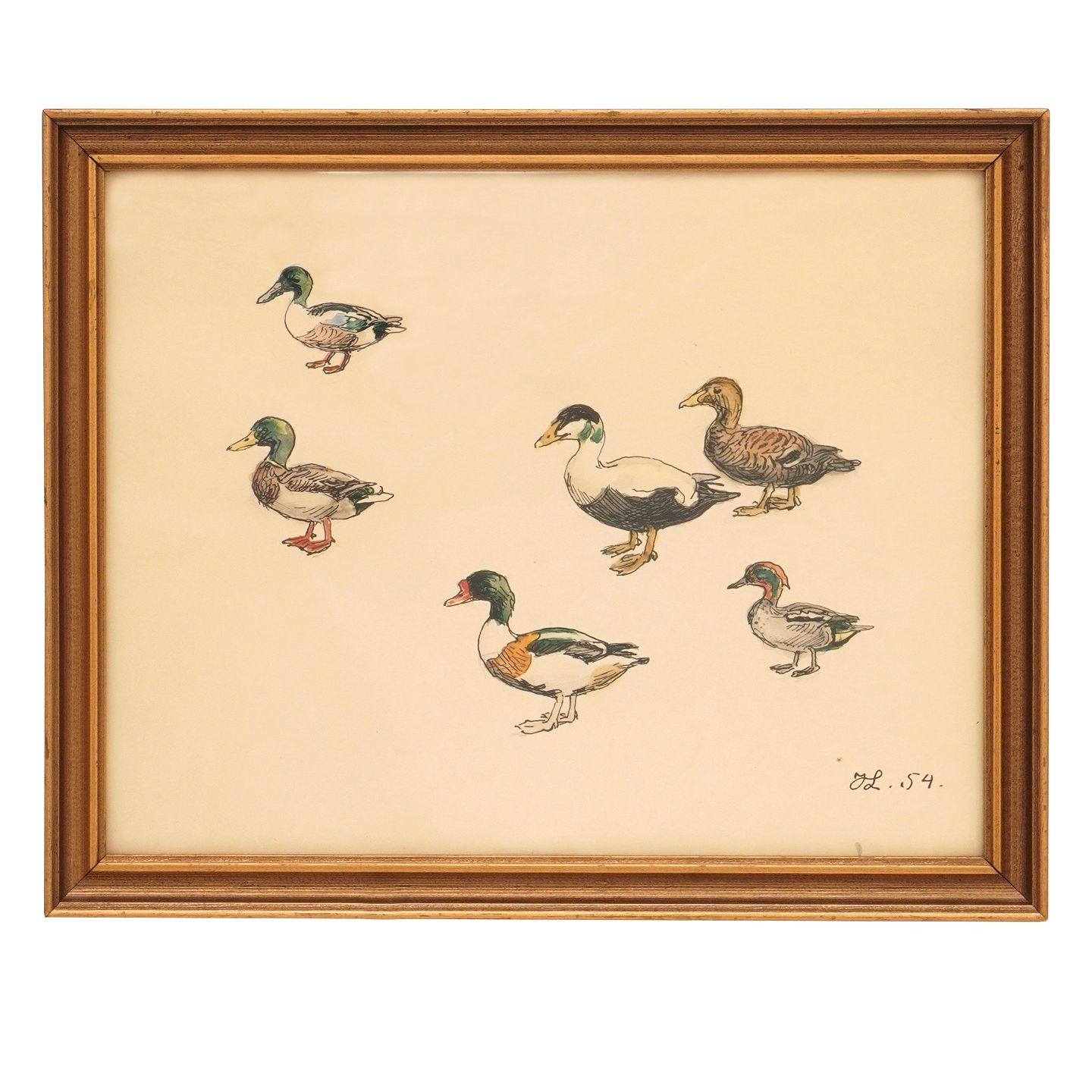 Johannes Larsen, 1867-1961, tusch og akvarel, studie af ænder. Signeret Johannes Larsen 1954. Mål: 26x32cm