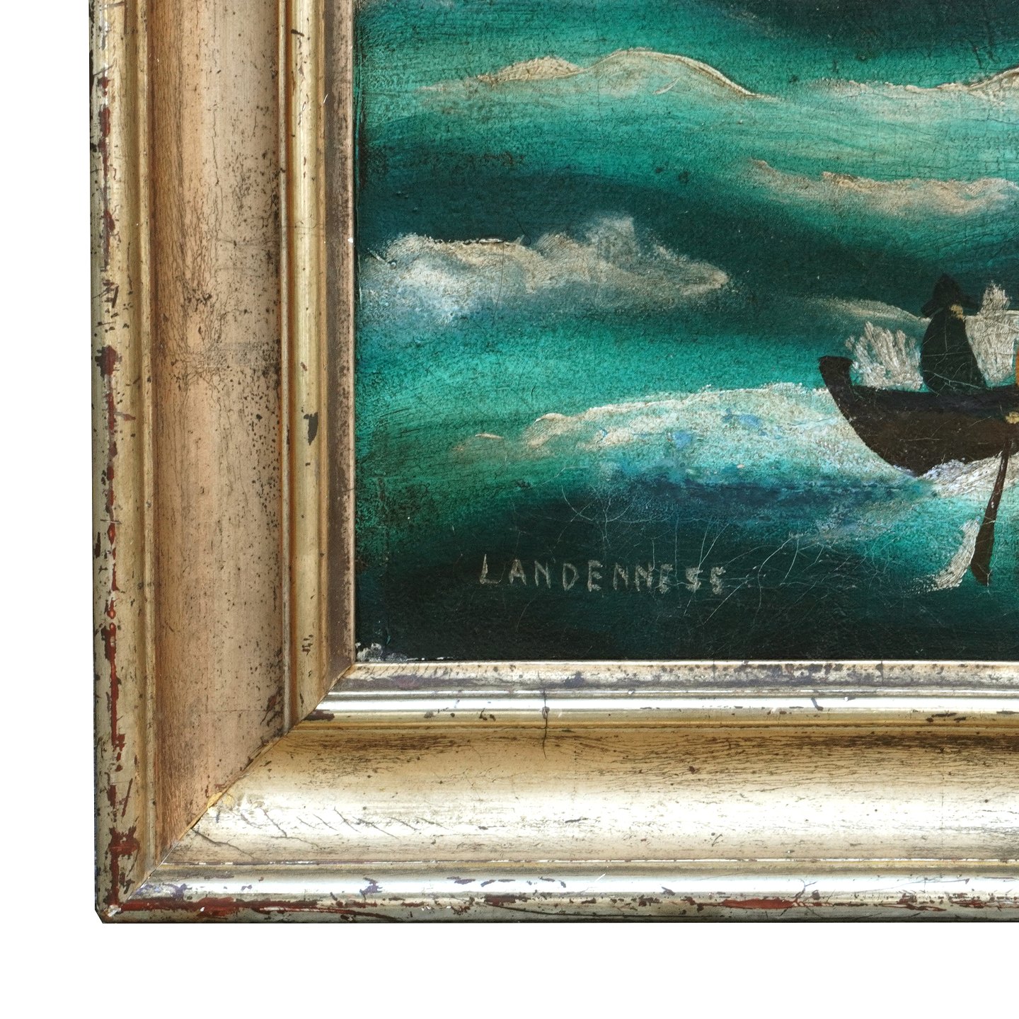 Seascape with whalers at Greenlands coast. Oil on canvas. Signed and dated "Landenne 55" (1855). Visible size: 61x72cm. With frame: 72x83cm