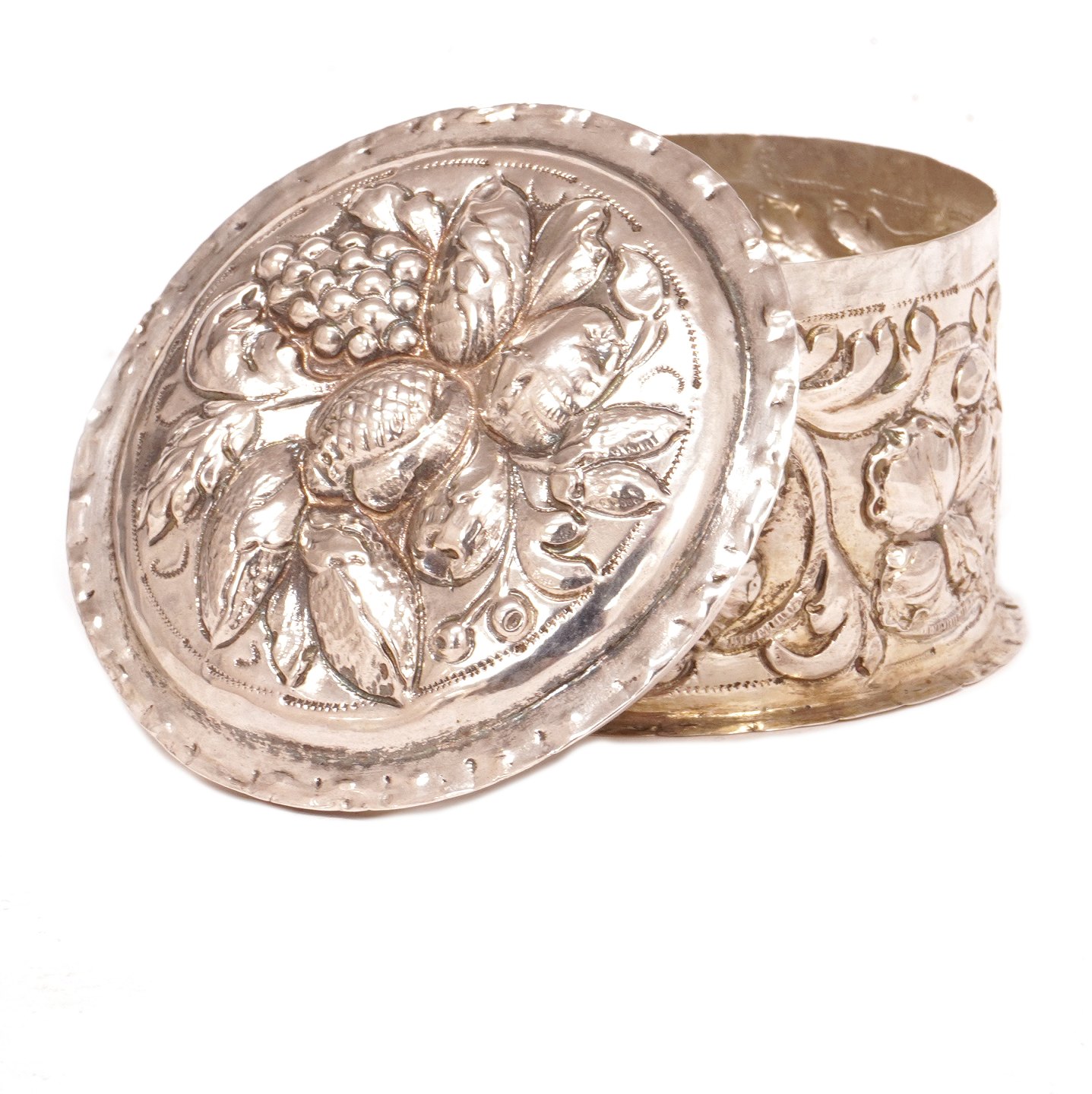 Drevet barok oblatdåse i sølv af Thore Sørensen, Aalborg, 1704-32. H: 6cm. D: 8,6cm
