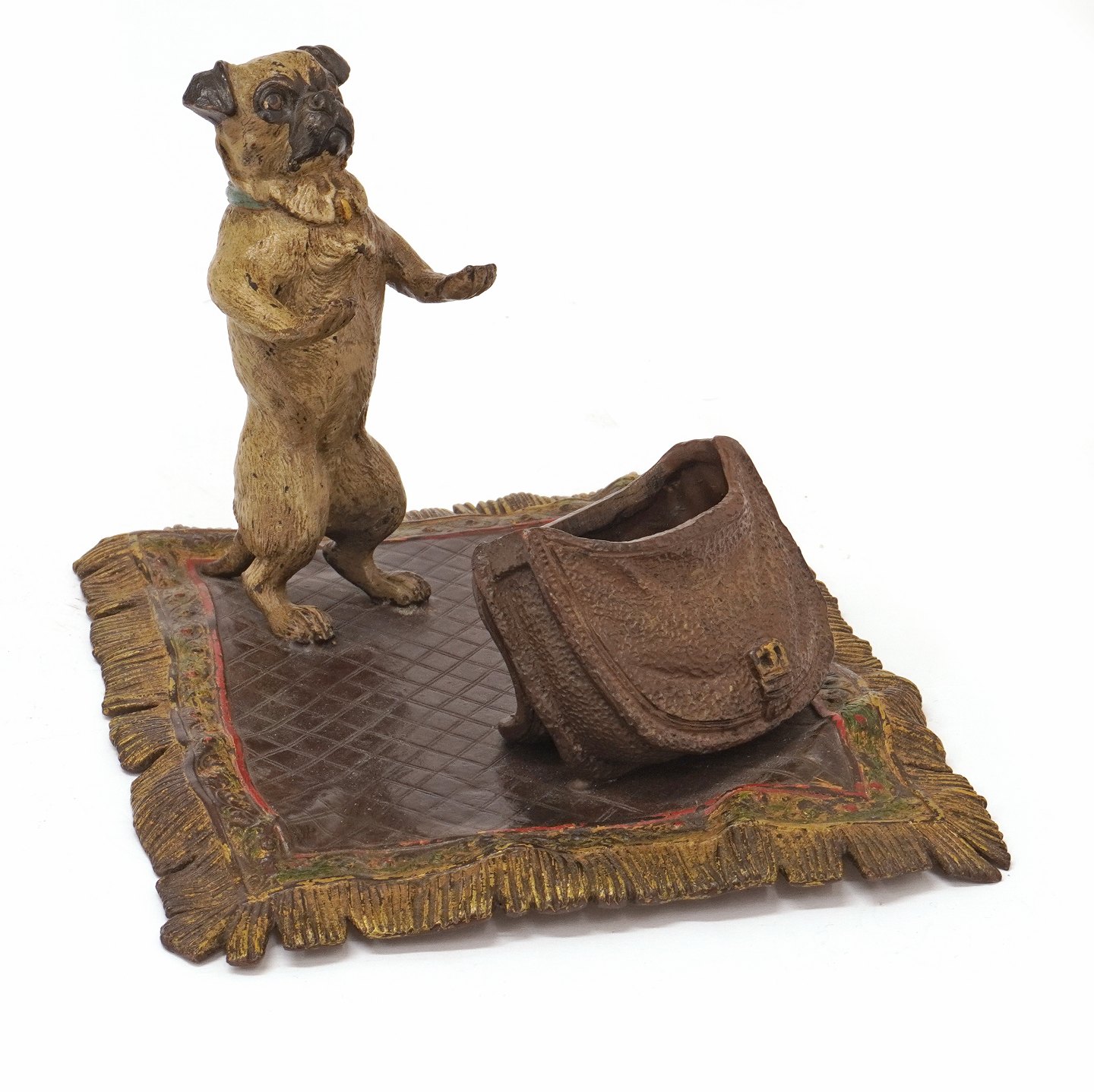 Stor wienerbronze i form af hund med taske på tæppe