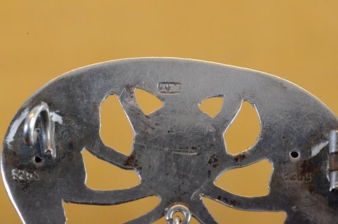 Broche skønvirke, Jugend, Art Nouveau af organisk mønster i sølv med lukket bagside. Dekoreret med cabochonslebne grøn agat i centrum af broche og på de 3 vedhæng. Stemplet 826S "TM". Art No. 35