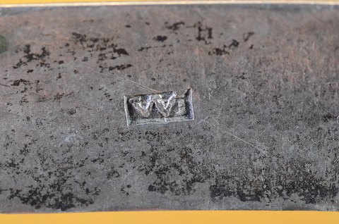 Shoe buckle pair, silver punched pattern, monogram SCD, dated 1845, with silver studs in each corner. Double stamped "WI" clamping component is iron. Str. 8.5 * 5.5 cm Art No.46