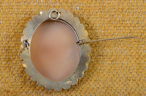 Cameo lady head cut off light conch in scalloped frame of gilded silver. Mounted as a brooch and pendant. Stamped 800. Str .: 4 * 3.5 cm. Art no. 48