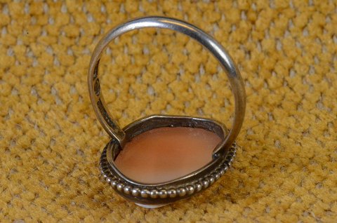 Camé ring of silver with lady head cut off conch, mounted in silver frame surrounded by silver beads. Size: small Art No. 52