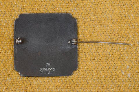 Georg Jensen broche designet af Arno Malinowski. Oxideret jern indlagt med Sterling sølv. Stemplet: GEORG JENSEN 5001C og Arno Malinowskis signatur; Teknik blandede metal der anvendes under 2.verdenskrig pga råvare mangel. Str.: 4,5*4,5 cm. Art No. 59