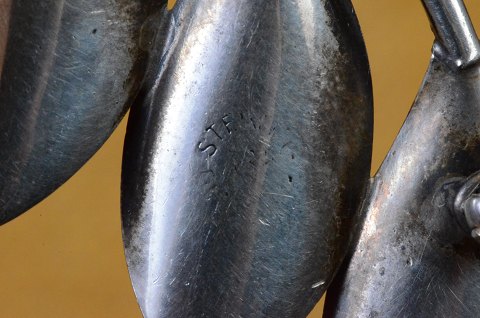 Brooch of silver shaped like small branch with 3 hazel and catkins. Stamped A & K Sterling Denmark. Aarre & Krog eftf. Randers 1949-90. Str .: 5 * 25 cm. Art No. 64