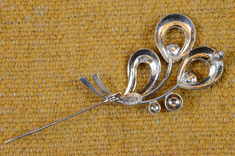 Broche af sølv bladformet og dekoreret med cubic zirkonia i lyseblåt. Stemplet Sterling H.S. Denmark. Herman Siersbøl. Str.: 5*3,3 cm. Art No. 69