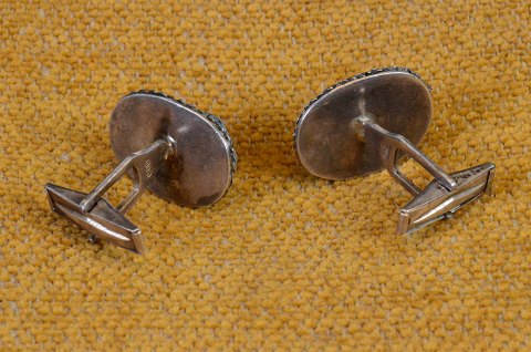 Manchetknapper med skarabæ af tyrkis keramik. Stemplet 900. Lille skade i glasuren på den ene manchetknap. Str.: 2,2*1,5 cm. Art. No. 98