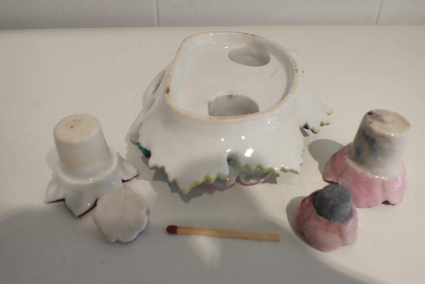Blækhus og sanddåse lavet som blomsterdekoration i porcelæn. Tysk 1800-tal. Ustemplet. Der er lidt kantafslag på det lyserøde låg. Længde: 13 cm. Bredde 11 cm.