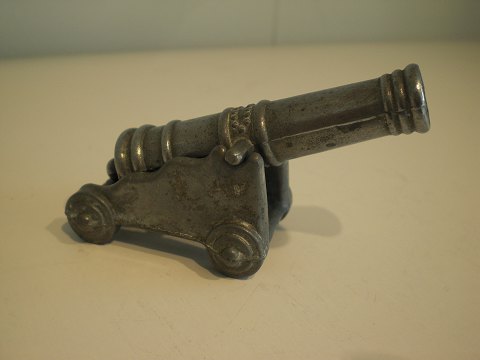Bord/dekorationskanon messingfarvet metal. Tohjulet feltkanon med bredt rør, rigt ornamenteret. 20 årh. Længde kanonrør: 17 cm. Samlet længde på: 19 cm. Samletnhøjde på vogn: 12,5 cm. Brugs- og aldersspor.