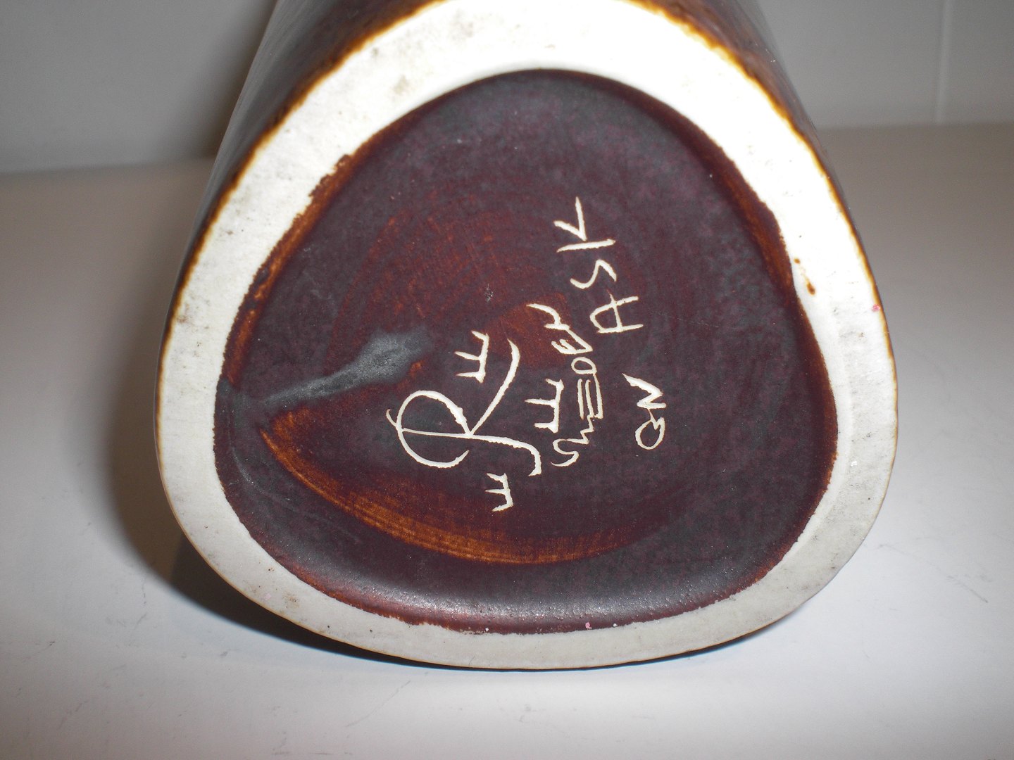 Gunnar Nylund (1904 - 1996) blødt, trekantet stentøjsvase, flammet glasur med blåt, jordrødt og gyldne farver udført hos Rørstrand (1940 - 1958). Signeret GN og ASK. Højde: 15 cm. Bredeste diameter: 4,5,6 cm. I fin stand.