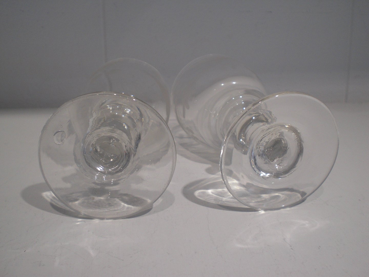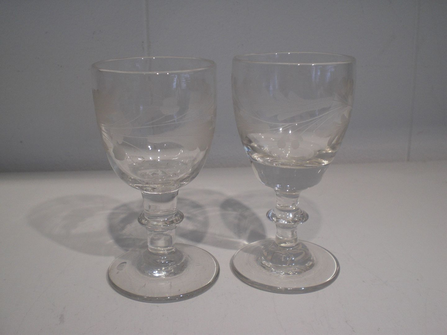 Holmegaard, 2 små hedvinsglas med egeløvsdekoration, 7 flige i blad, 2 agern, knap på stilk. Højde: 10 cm. Ca. 1870. Fin stand