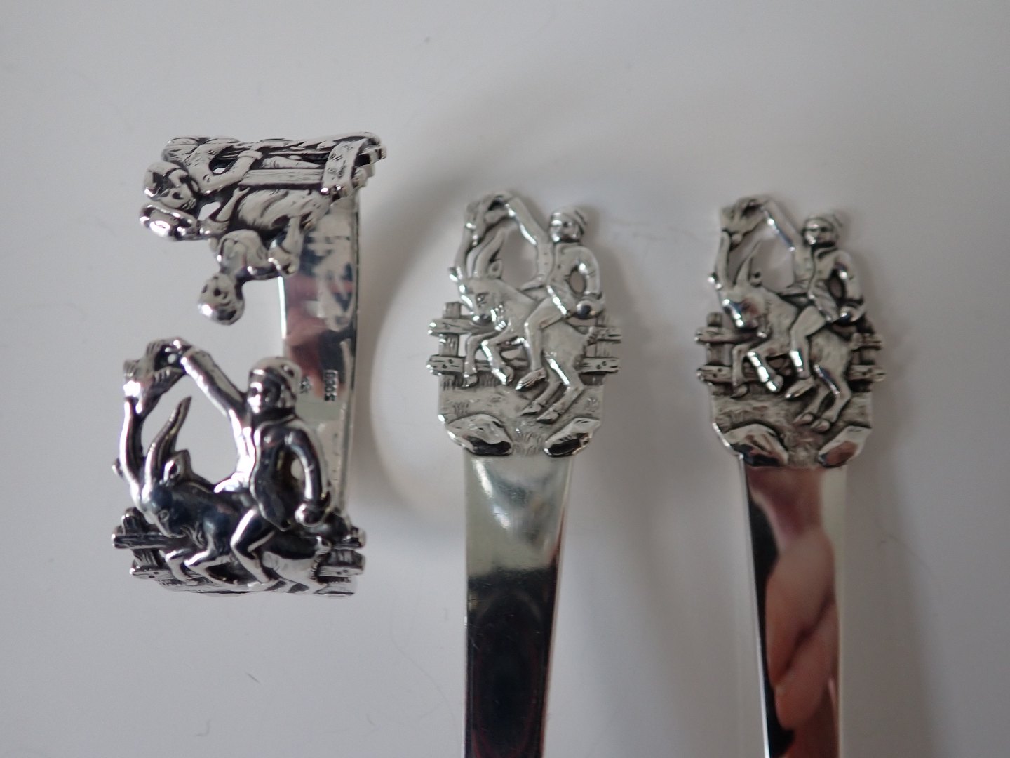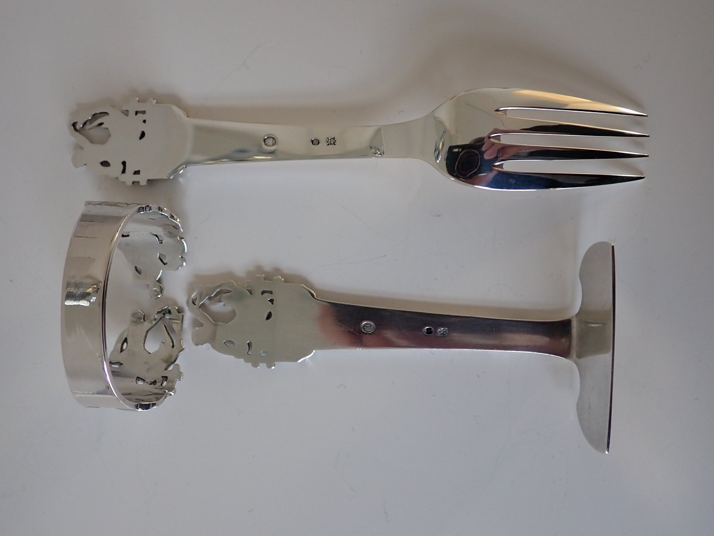 Horsens Sølvvarefabrik. Børnebestik fra "Eventyrserien" - gaffel, "skubopper" og servietring i tretårnet sølv. Motiv: "Klodshans." 1941. 1948 og 1950 Vægt: 30,8 gram, 26,4 gram og 28,7 gram. Længde: 15 cm., 10,6 cm og 4,9 x 2,4 cm. I fin stand uden indgravering.De tre "Klodshansting" samlet: 1600 kr. for de 3 dele. Gaffel: solgt. Skubopper: 550 kr. og servietring: Solgt.