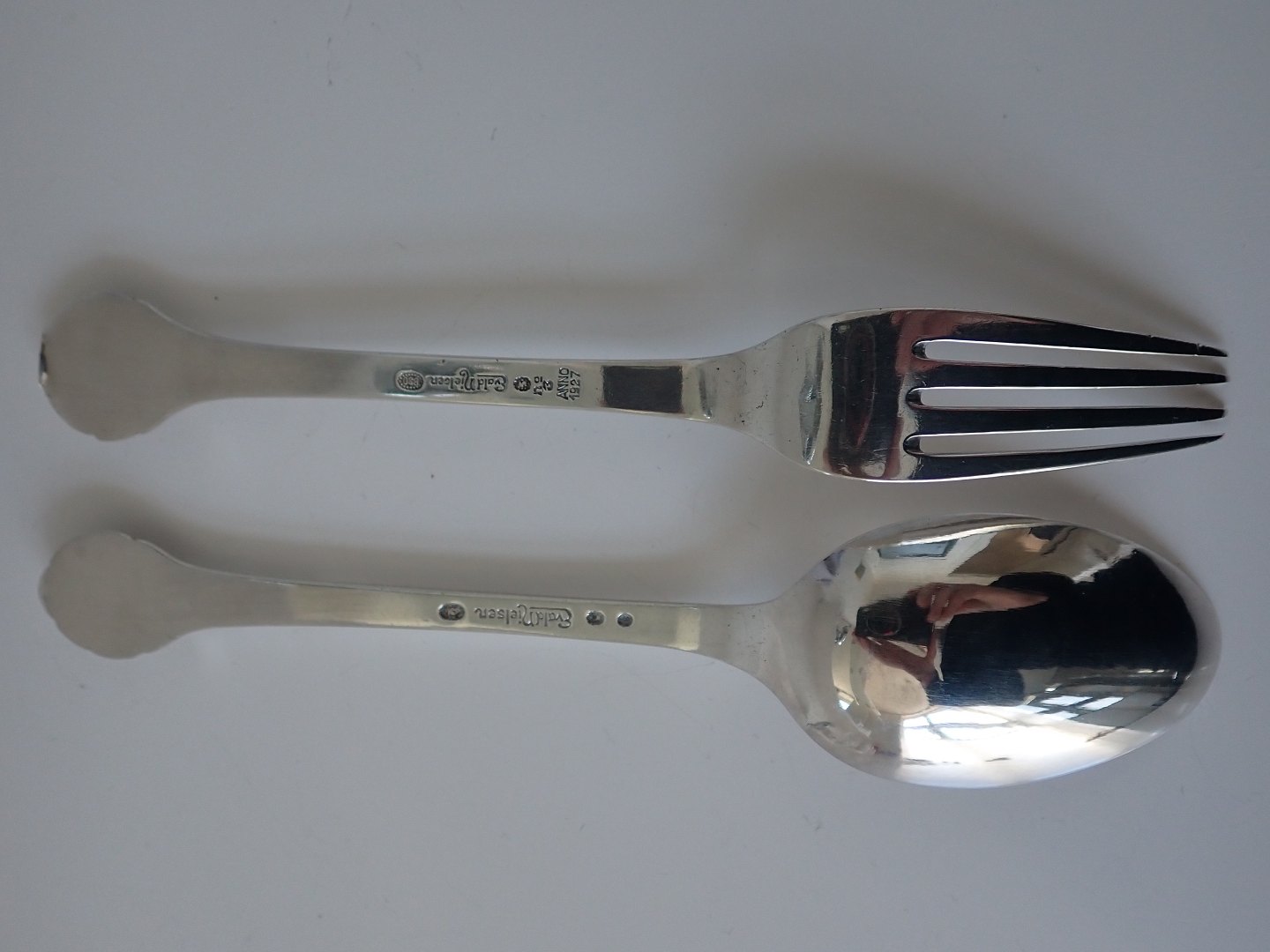 Evald Nielsen (1905 - 1970) - hammerslået barneske og barnegaffel i 830 sølv, bestik no. 3. 1927. Længde: 17,5 cm. Samlet vægt: 78,2 gram. Tidstypisk slid. Sælges kun samlet.