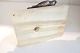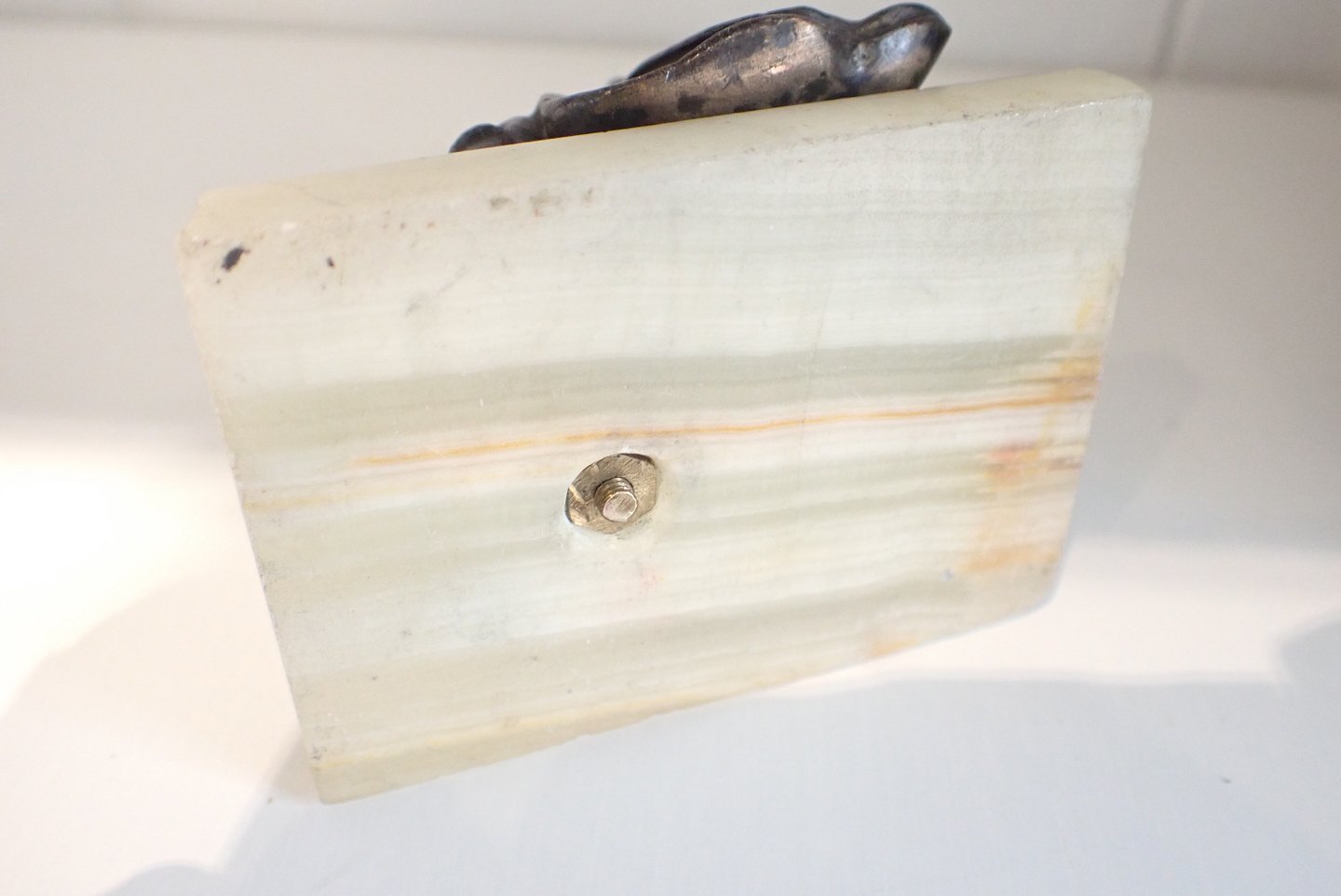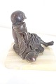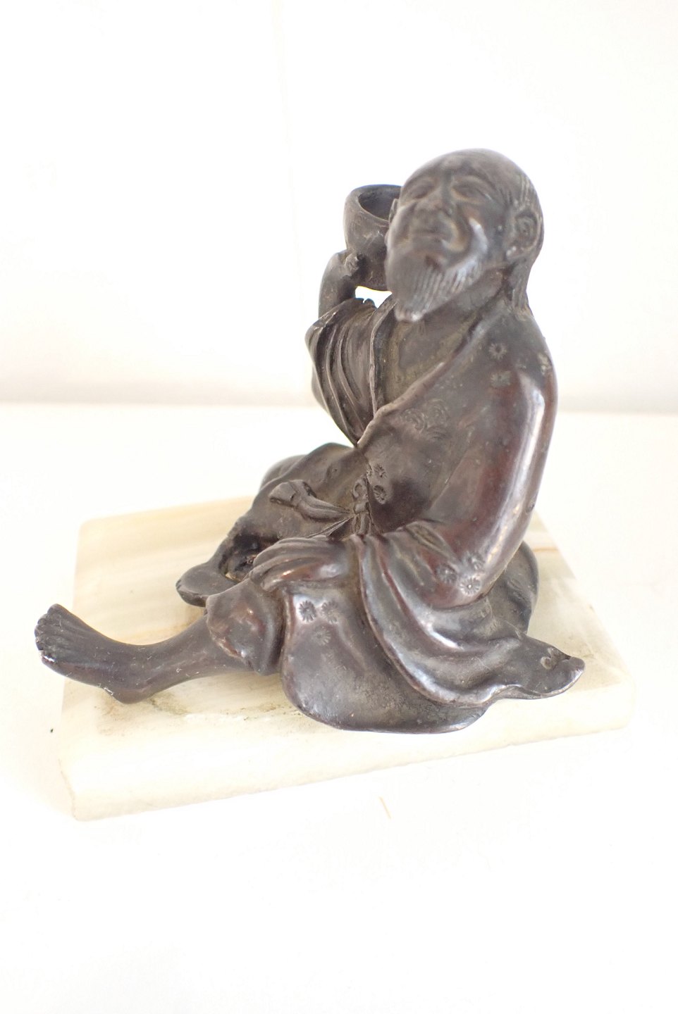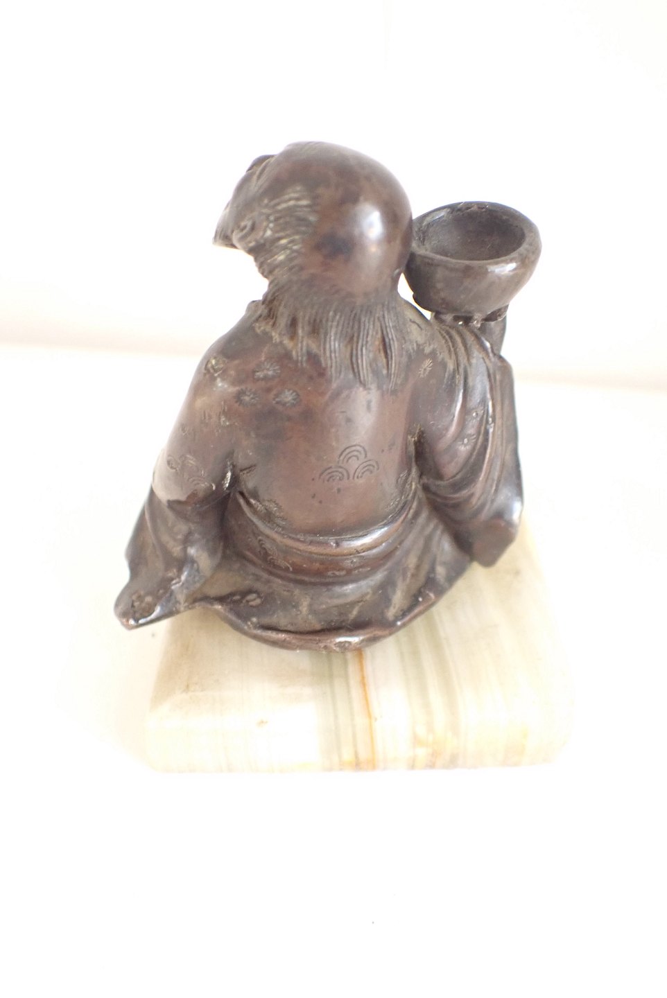 Japansk figur af bronze af en siddende klog mand med skål. Figuren er skruet (nyere skrue) på en stenplade, der ser ud til at være båndet calsit. Ca. 1890. Højde: 7,2 cm. I pæn stand, skruen fikserer ikke figuren helt fast,