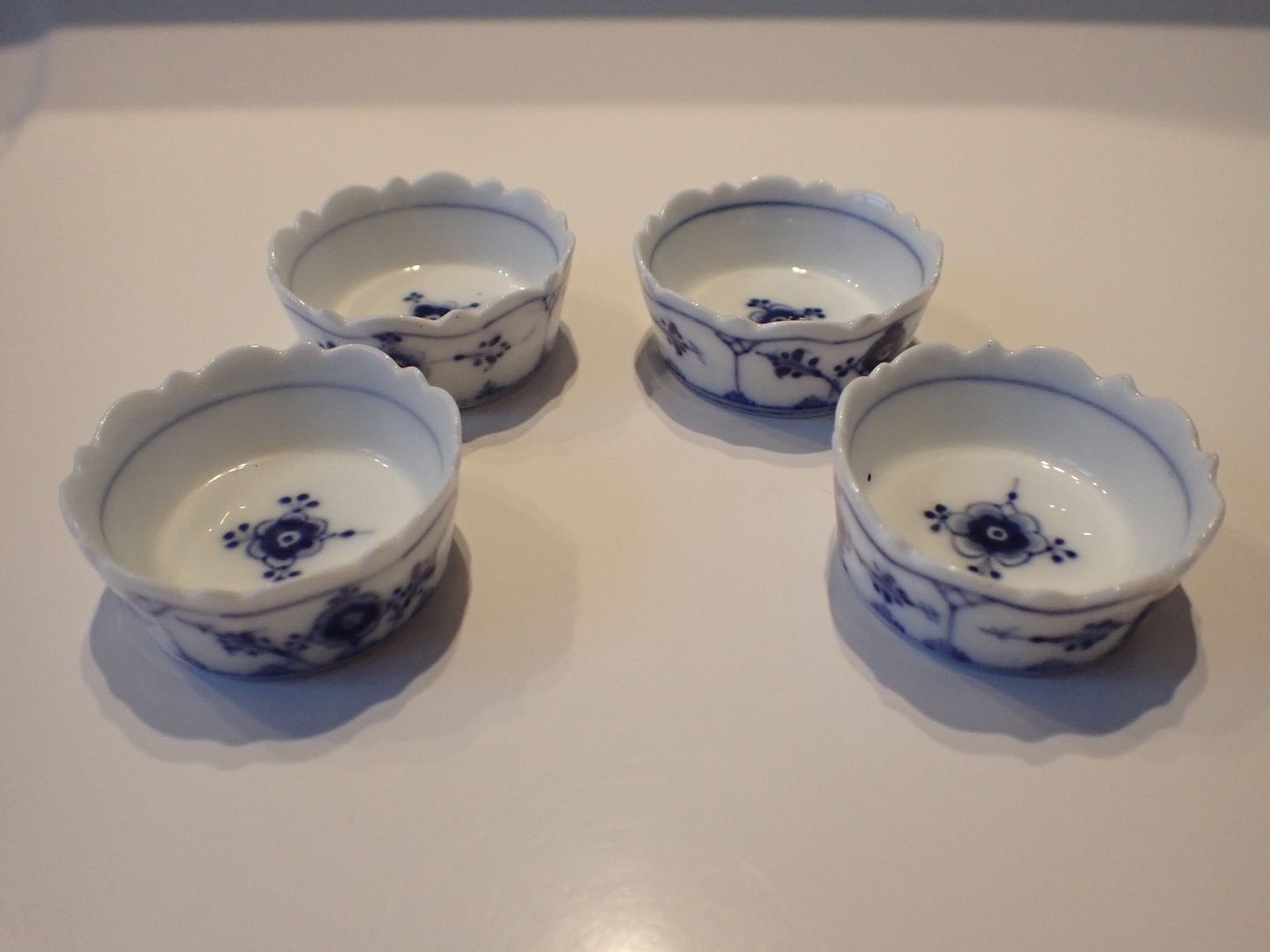 4 stk. kgl. Porcelæn - musselmalede, riflede saltkar. 1. sort. # 199. Efter 1923. Diameter; 4,3 cm. Højde: 1,8 cm. I fin stand. Sælges enkeltvis for 375 kr. pr. stk.