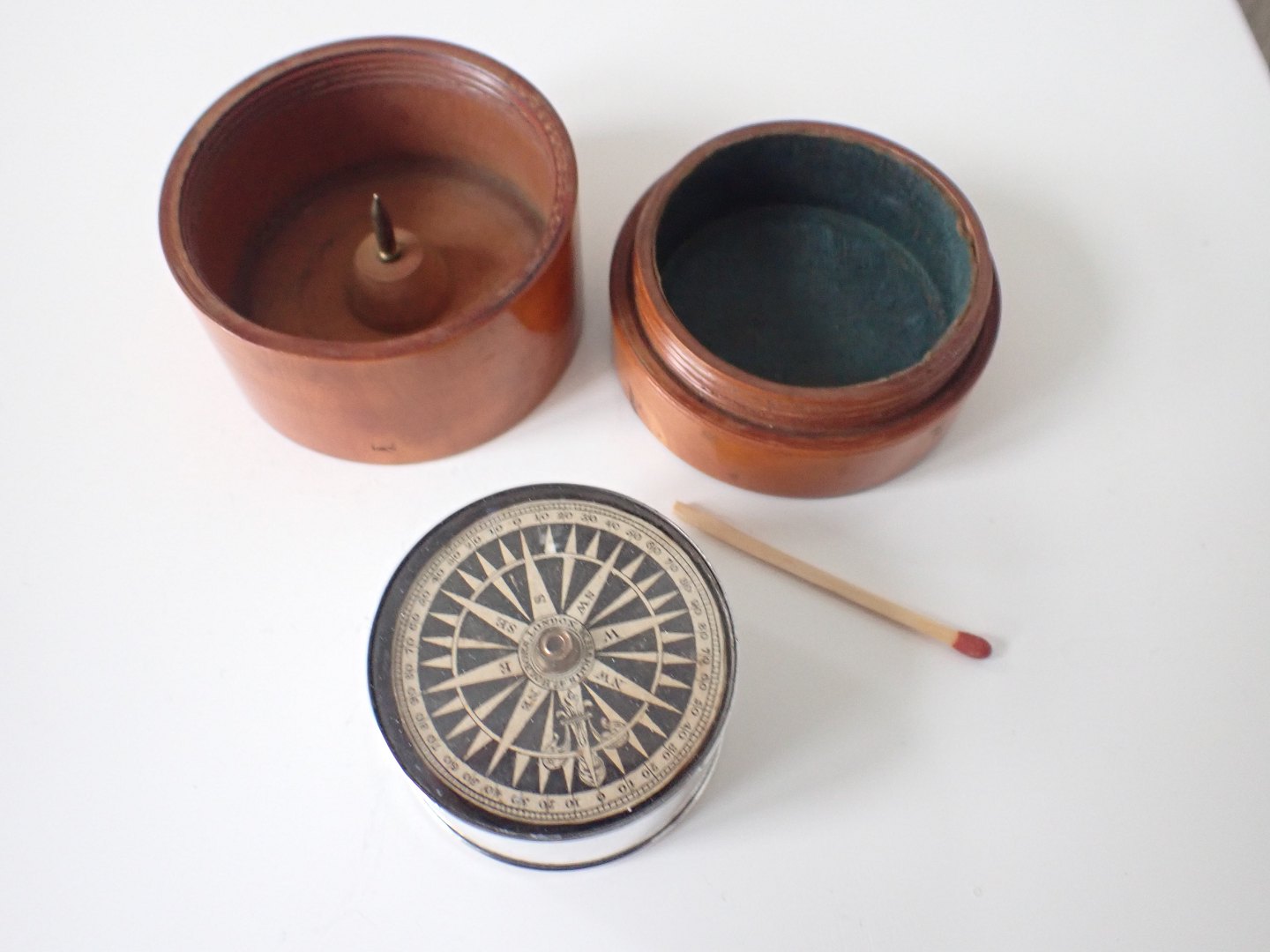 W. Harris kompas i sølvkappe i æske af frugttræ.