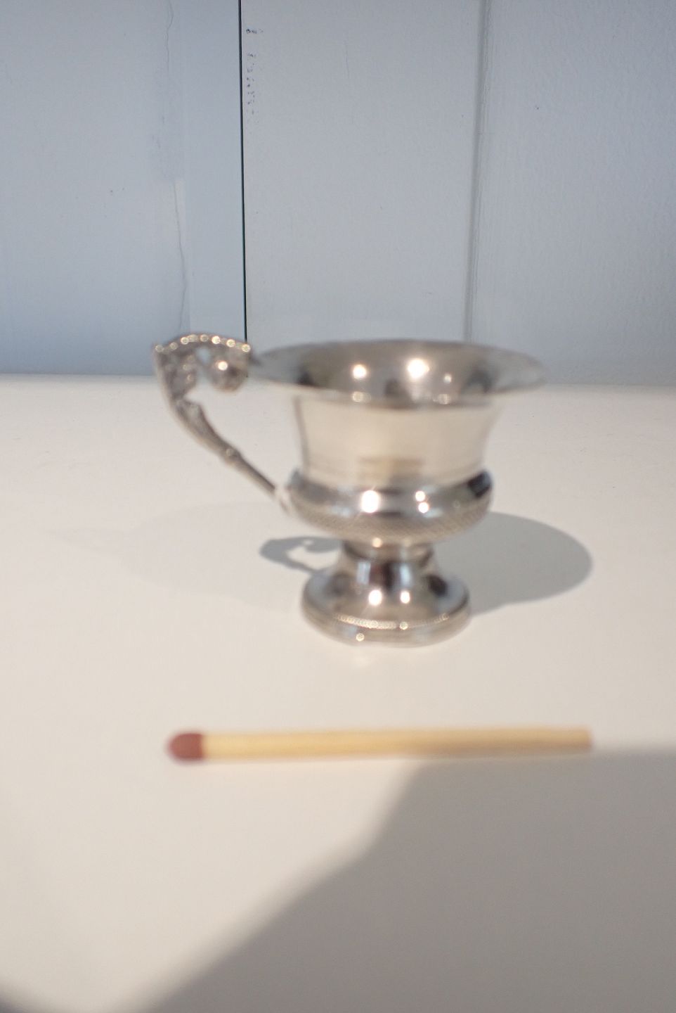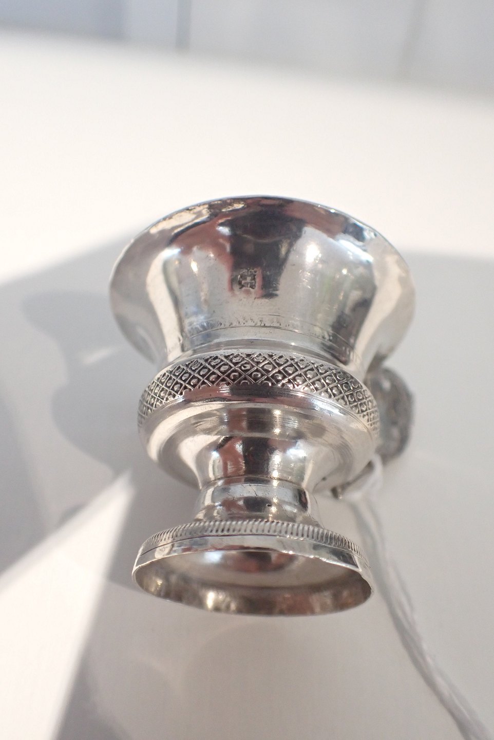 Russisk miniature vodka kop i sølv med mønsterdekoration 1800-tallet. Stempel ukendt 8,z ? og et kors. Højde: 4 cm. Diameter kop foroven u hank: 4,2 cm. Med hank: 5,5. I fin stand med tidstypisk slid. Vægt: 16,6 gram.
