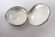 Æske til venstrer: Hans Jensen, Aah. (1937 - 1957) - glat rund pilleæske i 830 sølv. Stemplet HJ, 830s. Ca. 1940.Vægt: 11,2 gram. Højde: 1,4 cm. Diameter: 3,5 cm. I fin stand. Pris: 300 kr.