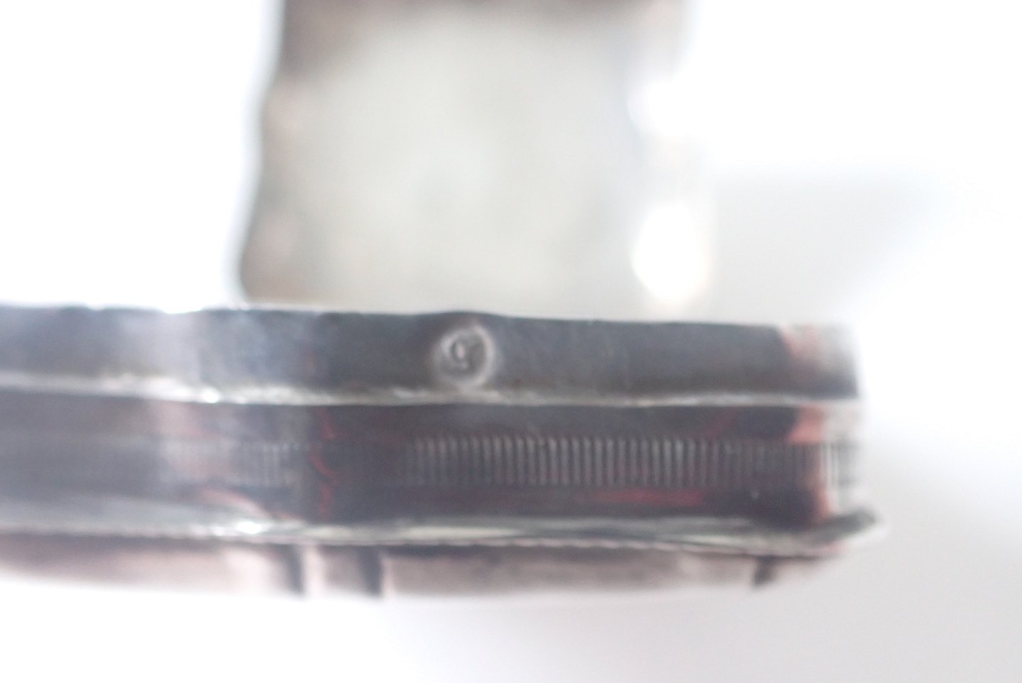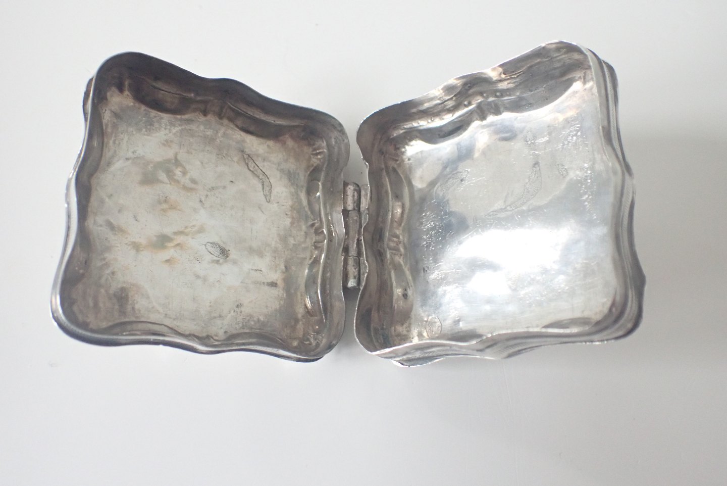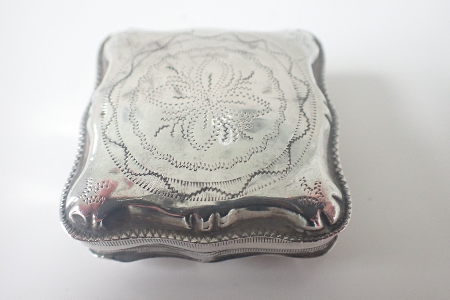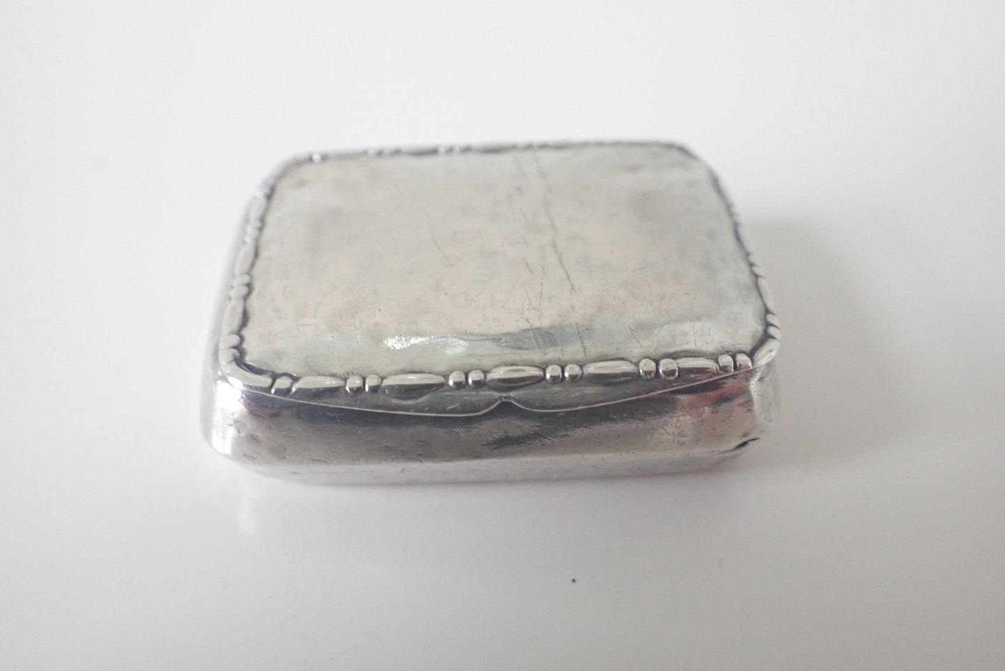 Æske bagerst: Firkantet pilleæske/tabatiere i tysk sølv med punslet dekorationer på forside, bagside og kanter. Tidlig 1800-tal. Vægt: 20,3 gram. Højde: 2,1 cm. bredde: 4,5 cm. I fin stand i forhold til alder. Pris: 600 kr.