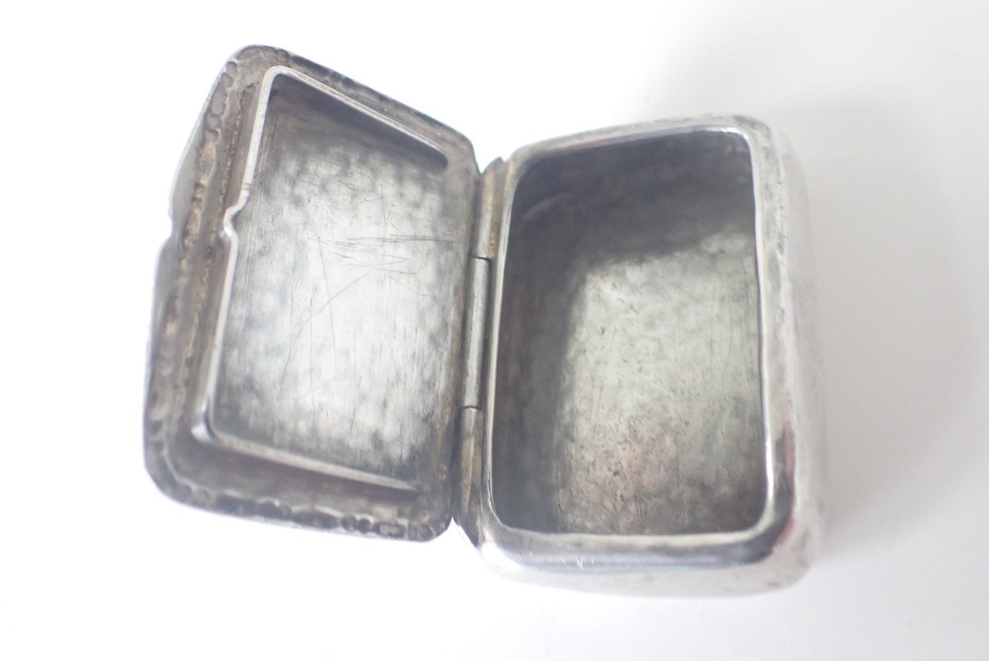 Æske til højre: Bernhard Hertz, Kbh. (1893 - 1937) - rektangulær hammerslået pilleæske med lille kantdekoration. Stemplet BH, Tretårne 1927 og Guardian C.F. Heise (1904 - 1932). Vægt: 16,2 gram. Mål: 1,2 x 3,1 x 4,2 cm. I pæn stand i forhold til alder. Pris: 425 klr.