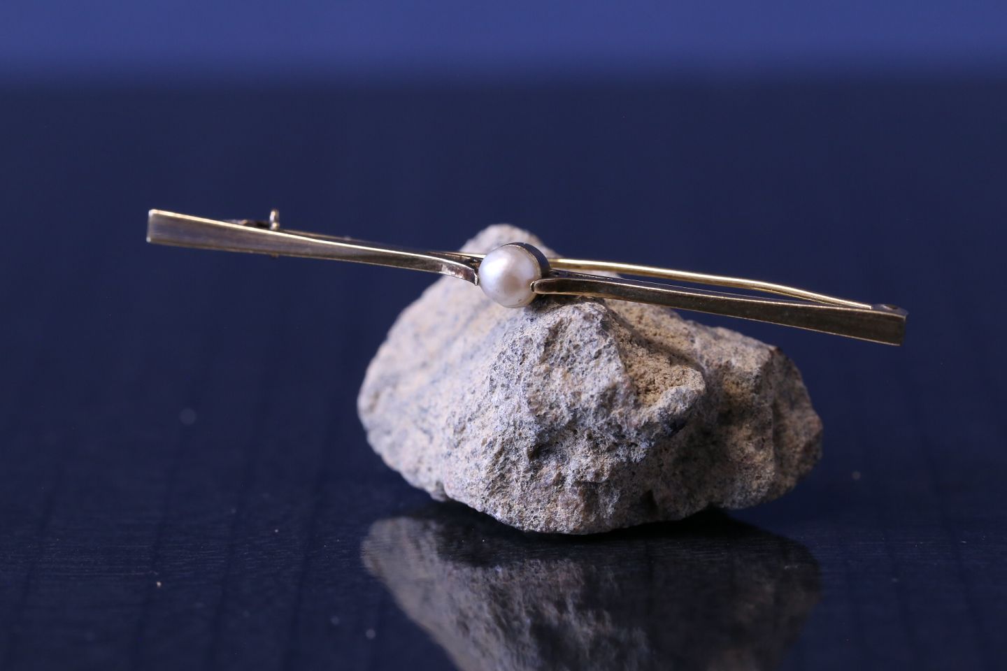 Beautiful gold brooch with a propeller shape in 14 carat gold, and a beautiful white pearl in the middle. Make your blazer extra beautiful for a festive occasion, and create your own identity. The brooch is with its dynamic shape, a beautiful piece of jewelry for almost any type of clothing.