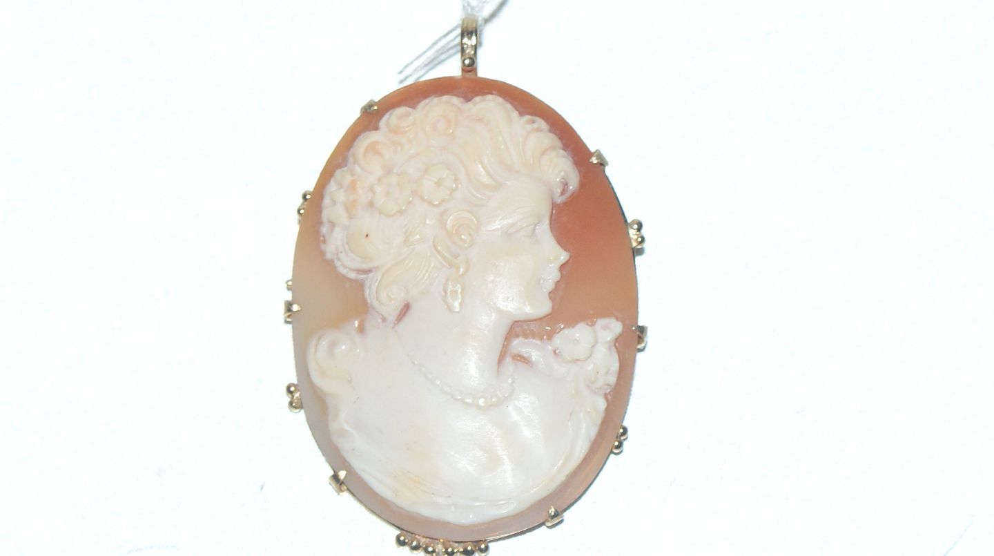 Large Brooch or Pendant with Camé, 14 Carat Stamp: 585 Size 5.8 x 3.8 cm Beautiful and well maintained. The piece of jewelry is not physically available in the store, but can be displayed upon request.