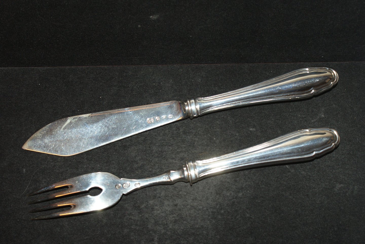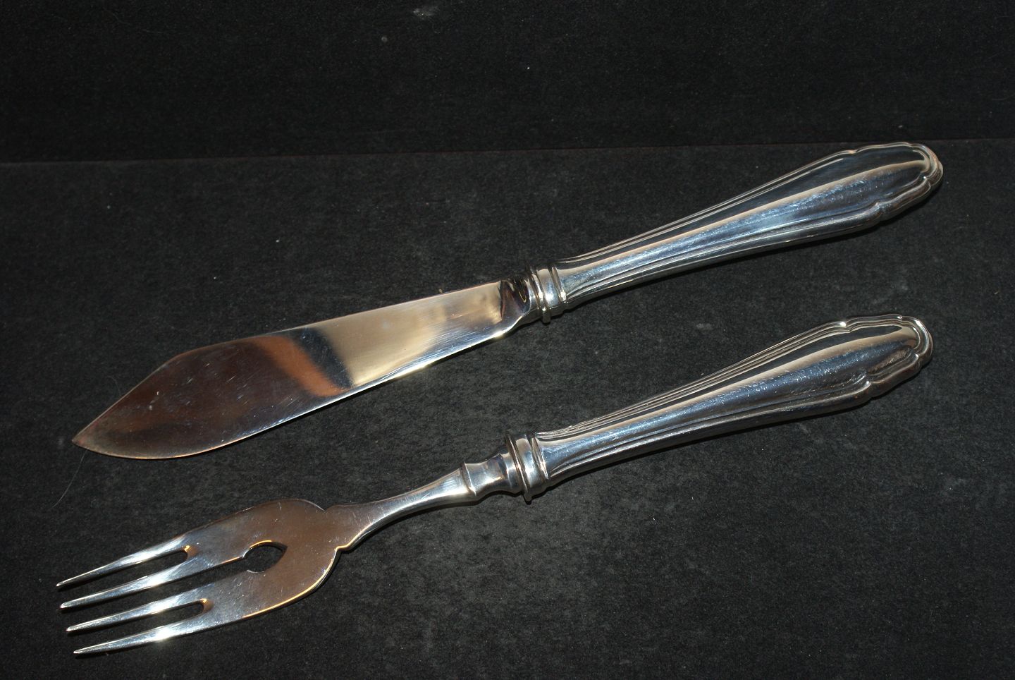 Fiskebestik sæt A.Michelsen 1920 Sølv A. Michelsen Stempel: Tre Tårne "20", AM, Krone over M 1 stk Kniv 20,2 cm. 1 stk Gaffel 19,2 cm. Flot og velholdt, samt poleret