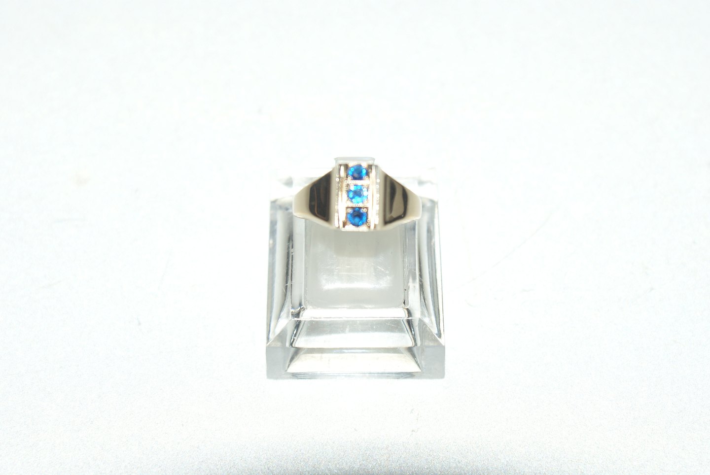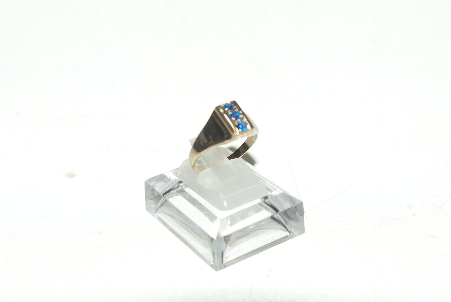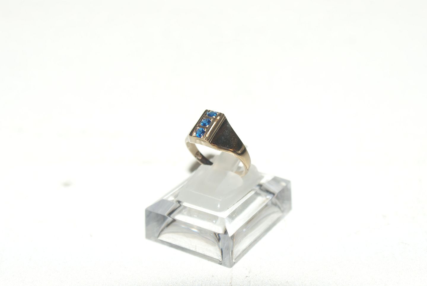 Damering med blå sten 8 karat guld Stemplet HS 333 Størrelse 58 Pæn og velholdt stand Tjekket af guldsmed og poleret Kontakt os for yderligere info da varen ikke er fysisk i butikken