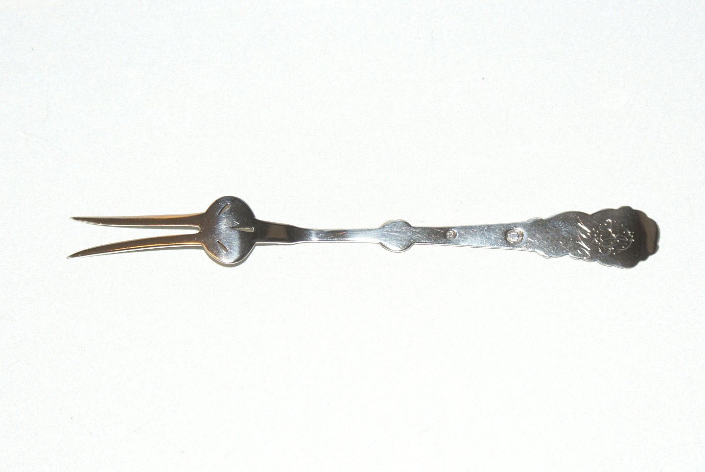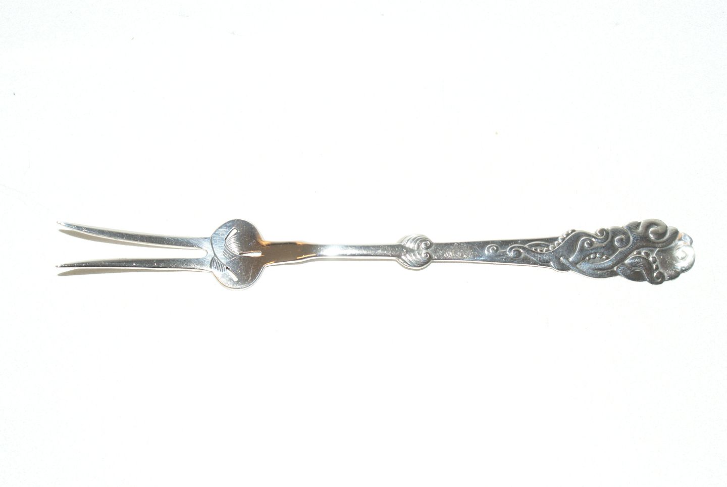 Tang, Pålægsgaffel med gravering Sølv Der er forskellige Årstal Længde 16 cm. Velholdt stand Alt bestik poleret og pakke i pose