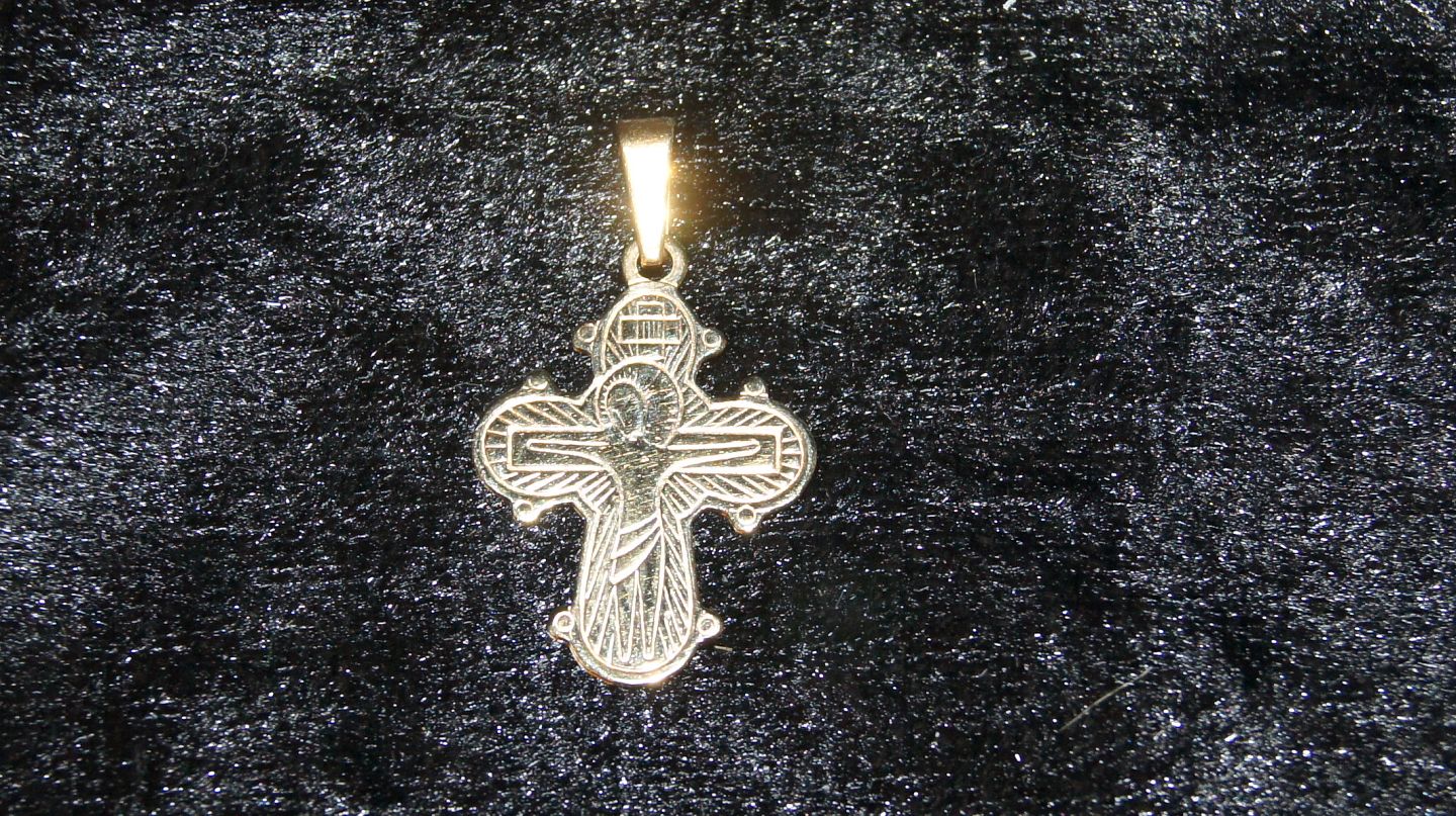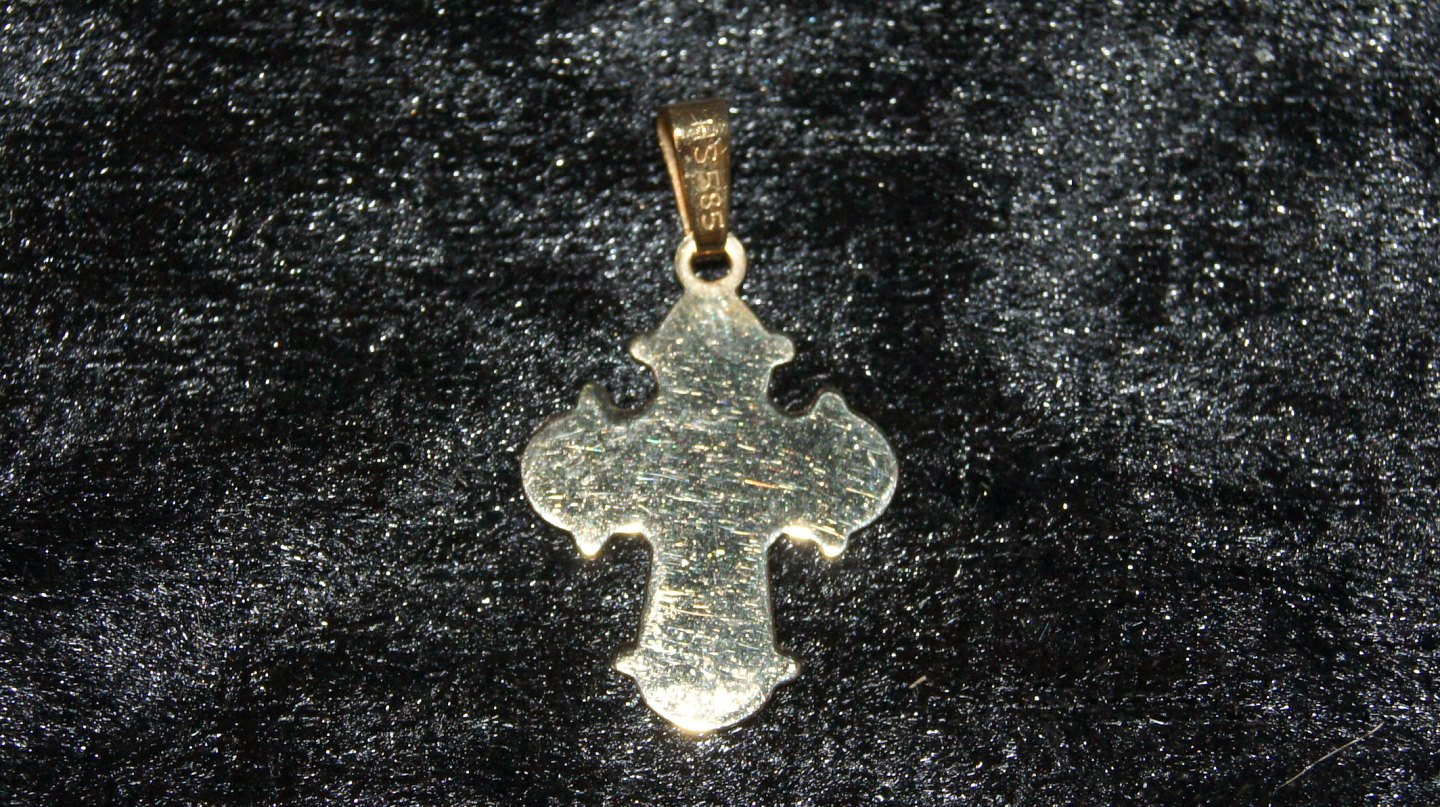Dagmar Cross 14 carat Gold Stamped HS 585 Height 2.9 cm approx Width 16.68 mm The item has been checked by a jeweler and it is not physically available in our store, so contact us for further info or a demonstration