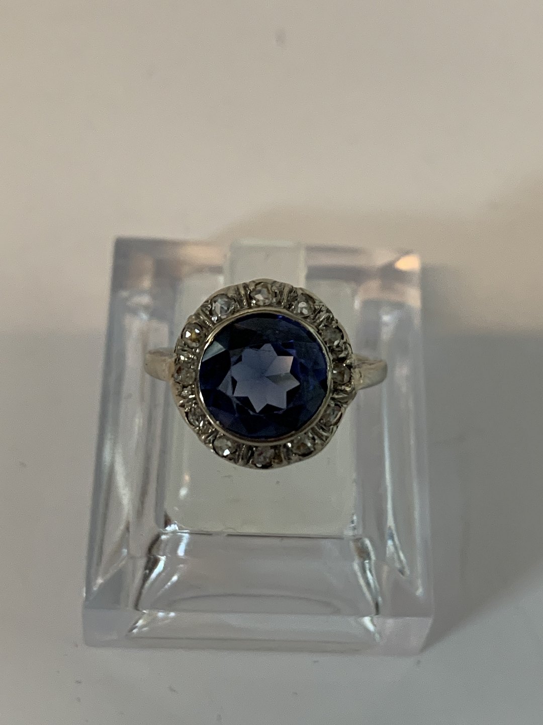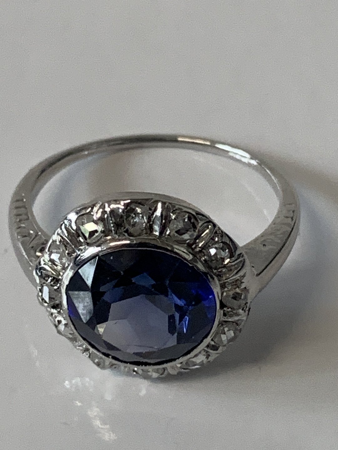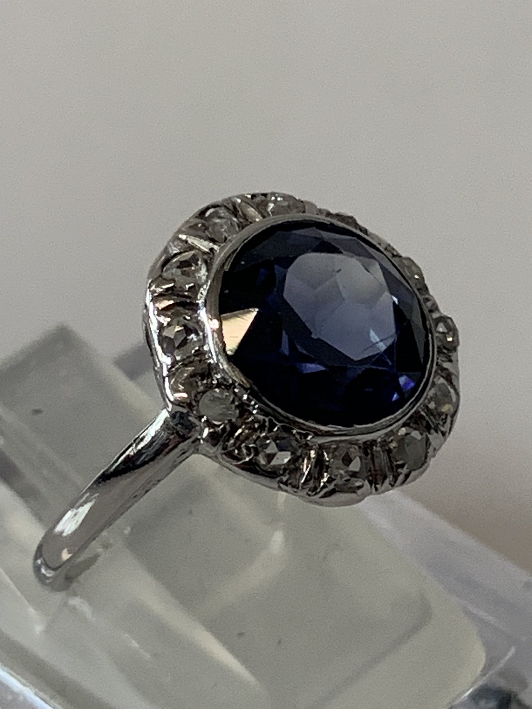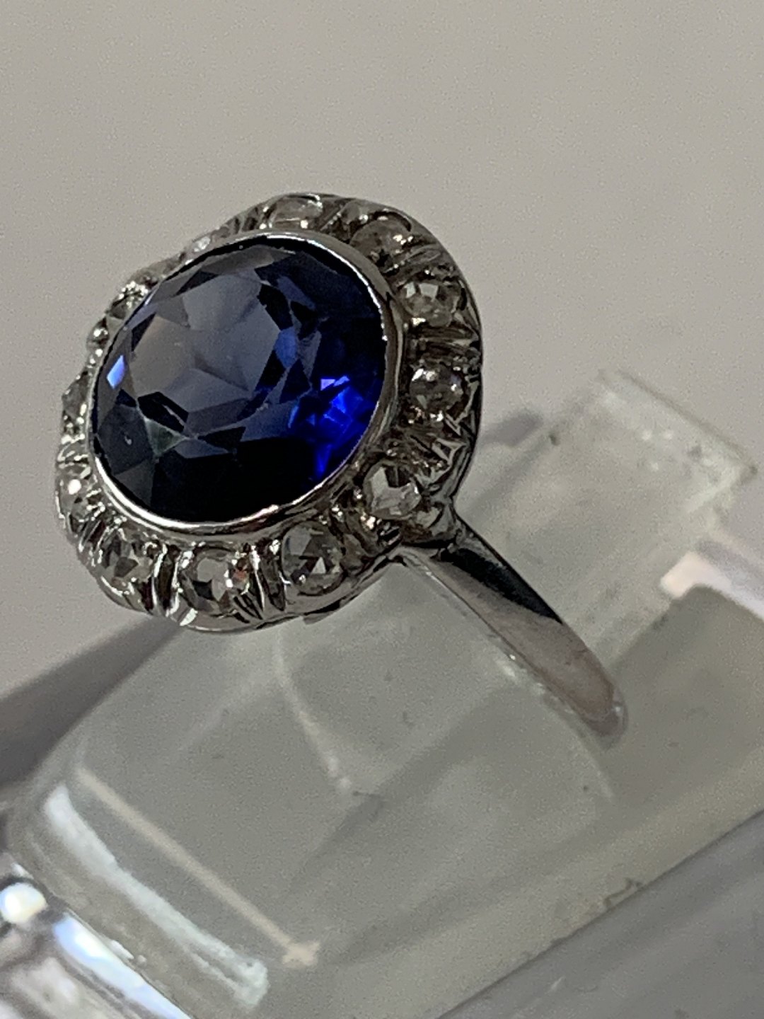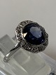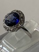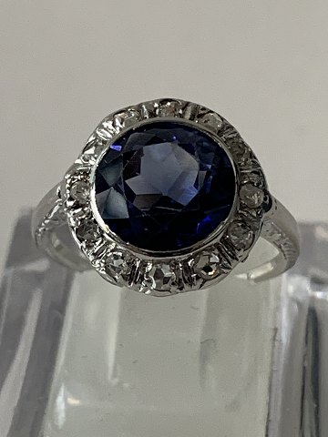 Rosetring i 14 karat hvidguld med diamanter og 1 blå safirer.