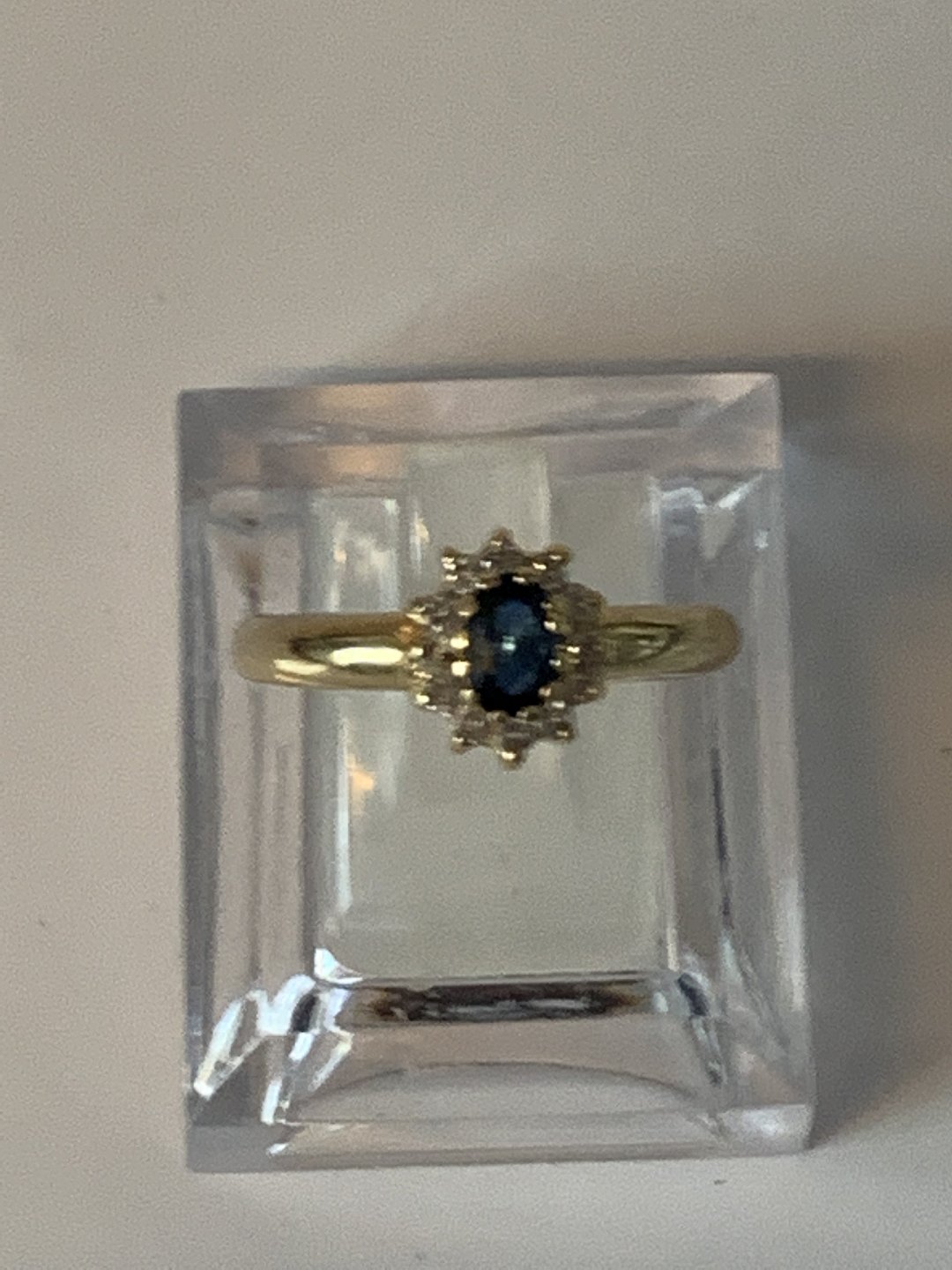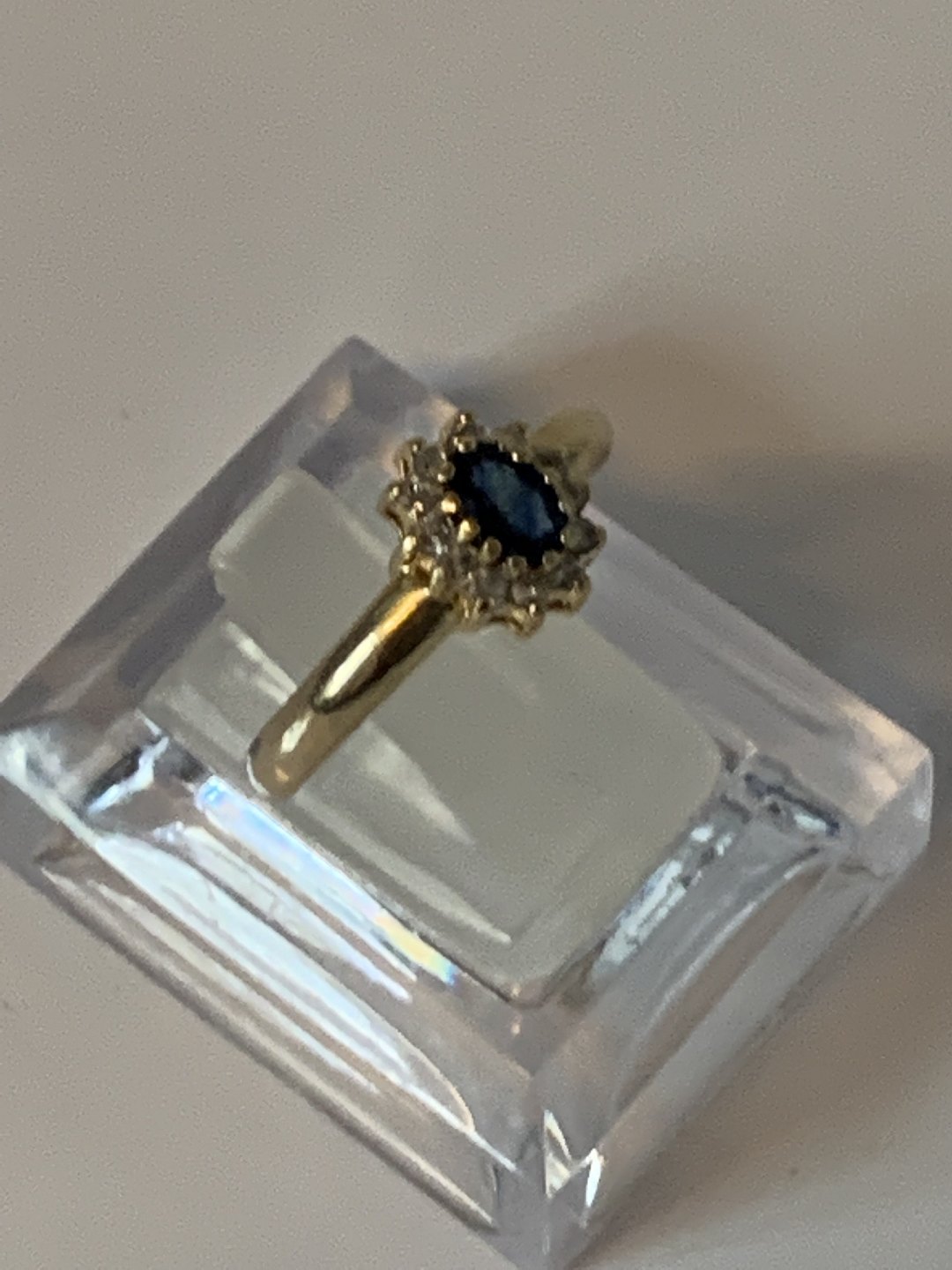 Damering med Diamant og blå safir i 18 karat guld Stemplet 750 Størrelse 60 Tjekket af guldsmed Flot og velholdt stand. Varen findes ikke fysisk i butikken. Kontakt os for fremvisning
