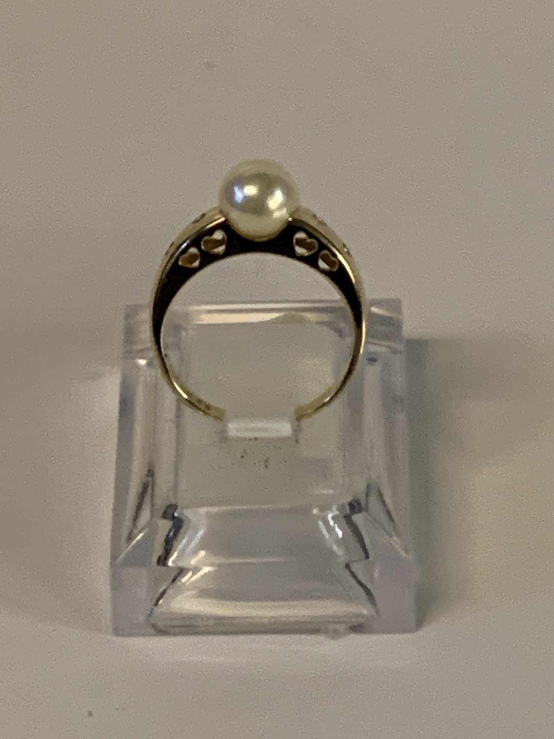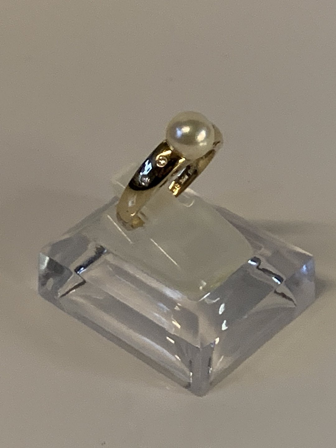 Ladies ring with diamonds and a pearl in 14 carat gold