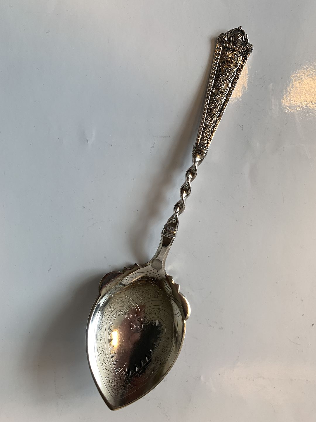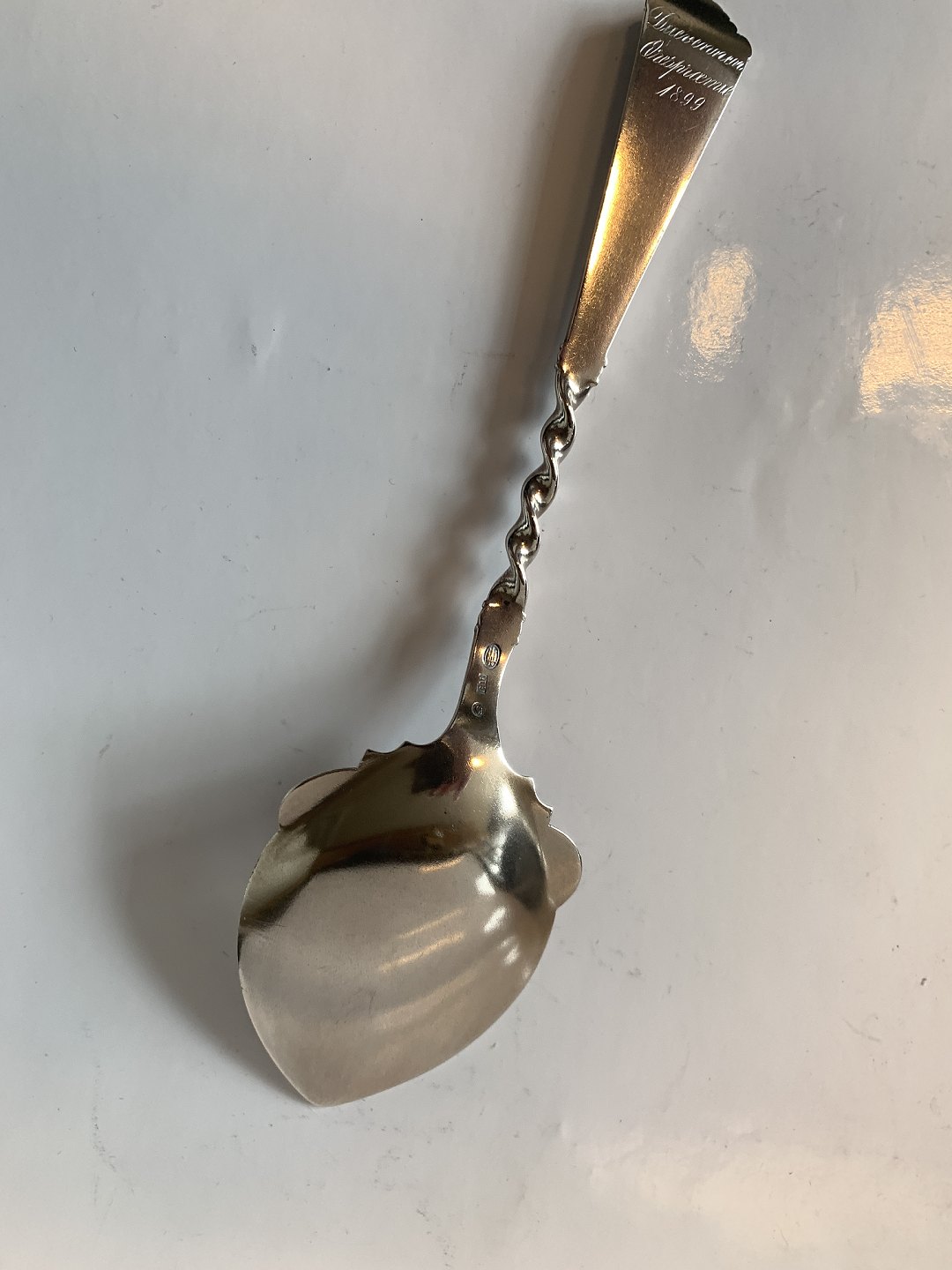 Petit Four /Kagespade i Sølv Længde ca 14 cm Stemplet 3 Tårne Produceret År.1899 med gravering Pæn og pudset stand Pakket i pose