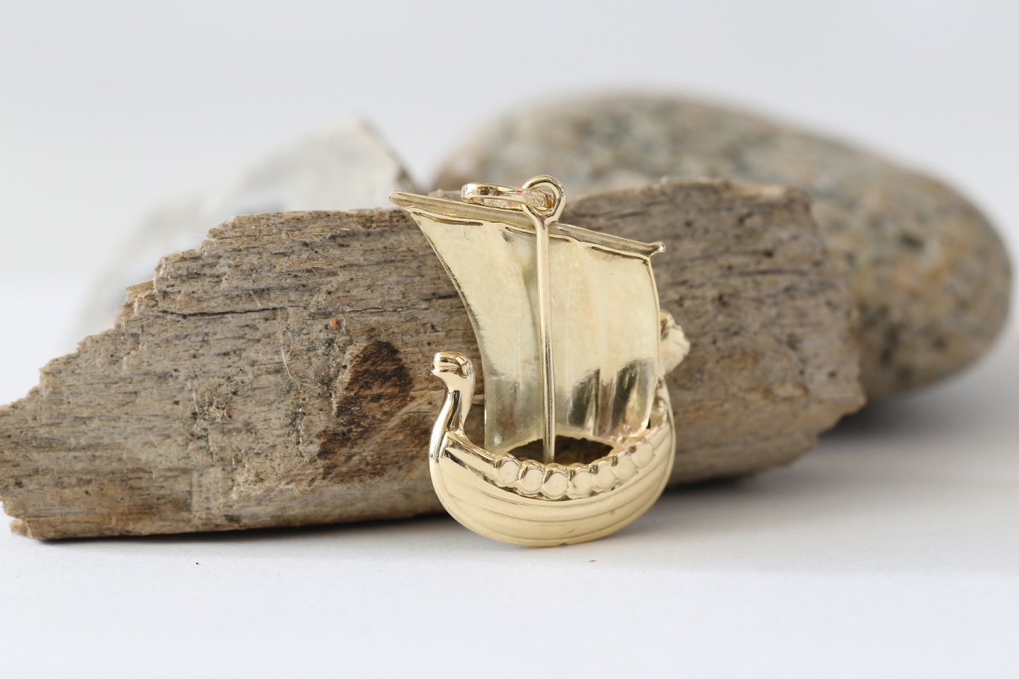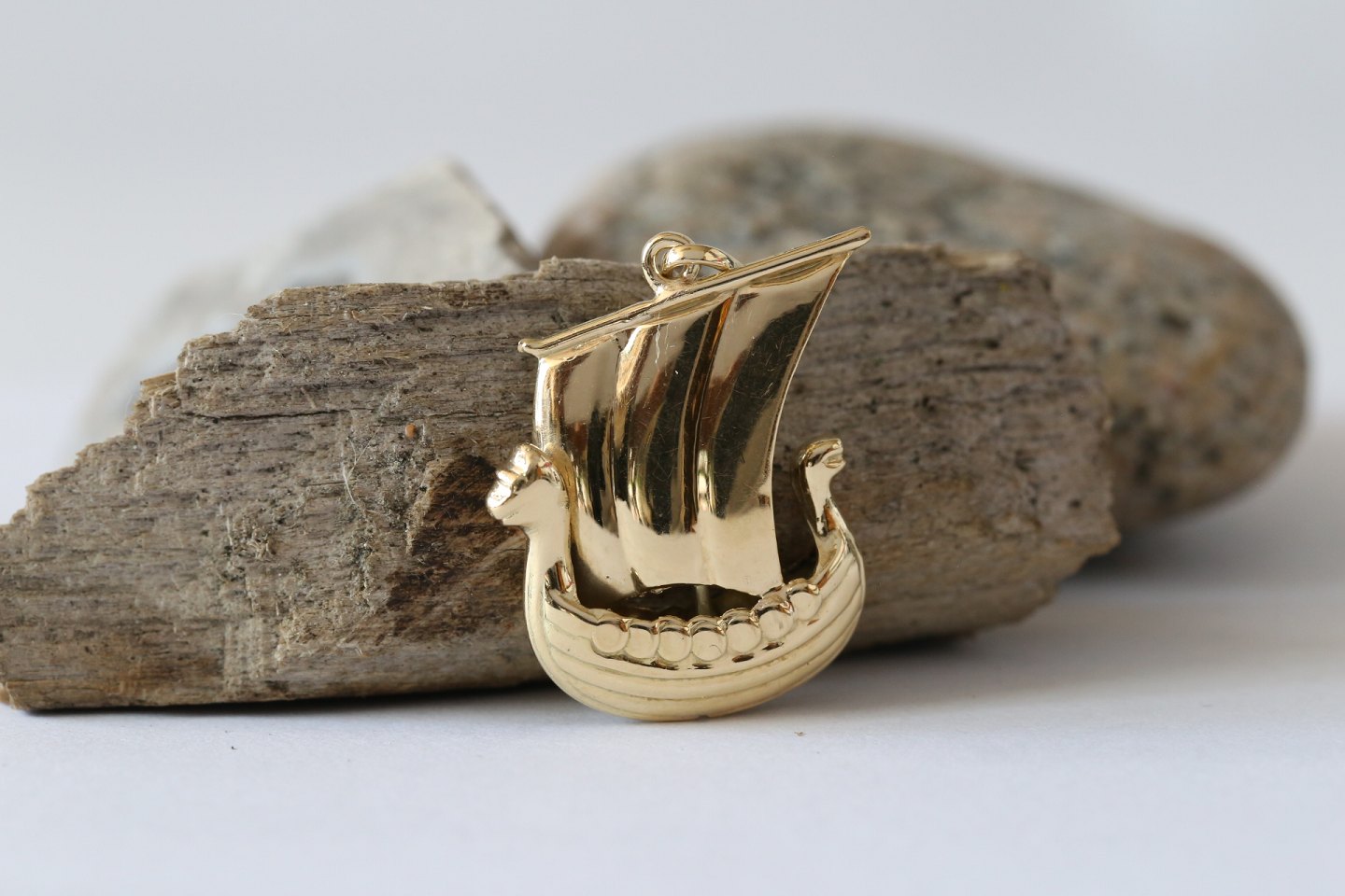 Smukt og detaljeret vedhæng i 14 karat guld, formet som vikingeskib. Smykket har mange flotte detaljer, der gør det helt specielt. Både på forside og bagside er detaljerne gennemførte, og giver vedhænget et enestående look.