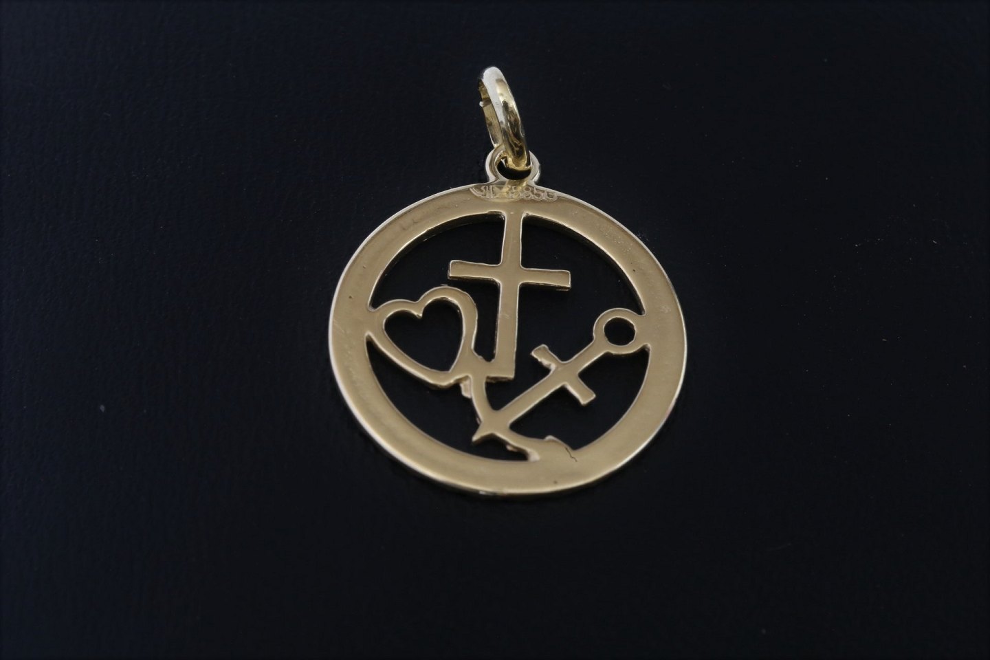 Smukt guldsmykke med symbolerne for tro, håb og kærlighed. Udført i 14 karat guld, og lavet med flotte detaljer. Ideelt som konfirmationsgave eller dåbsgave, der kan bæres hele livet. Smykket kan hænge i en guldkæde om halsen.