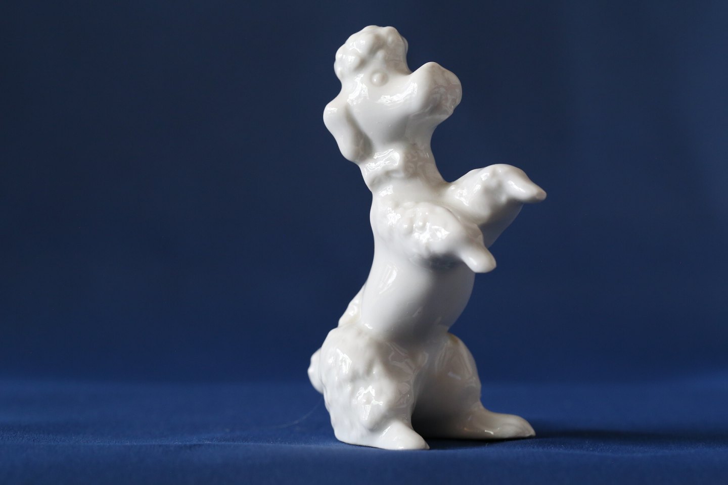 Porcelænsfigur i hvidt porcelæn af kongepuddel.