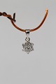 Smukt lille stjerneformet vedhæng i 14 karat hvidguld, der vil være elegant i en tynd guldkæde om halsen. Vedhænget er lille. Alligevel vil det stråle al sin elegance ud, gennem de små indlagte brillanter. Læg mærke til detaljen, at den ene brillant er fremskudt, i forhold til de øvrige. En smuk detalje, der - trods den lille størrelse - gør dette vedhæng til en stor fornøjelse at bære.
