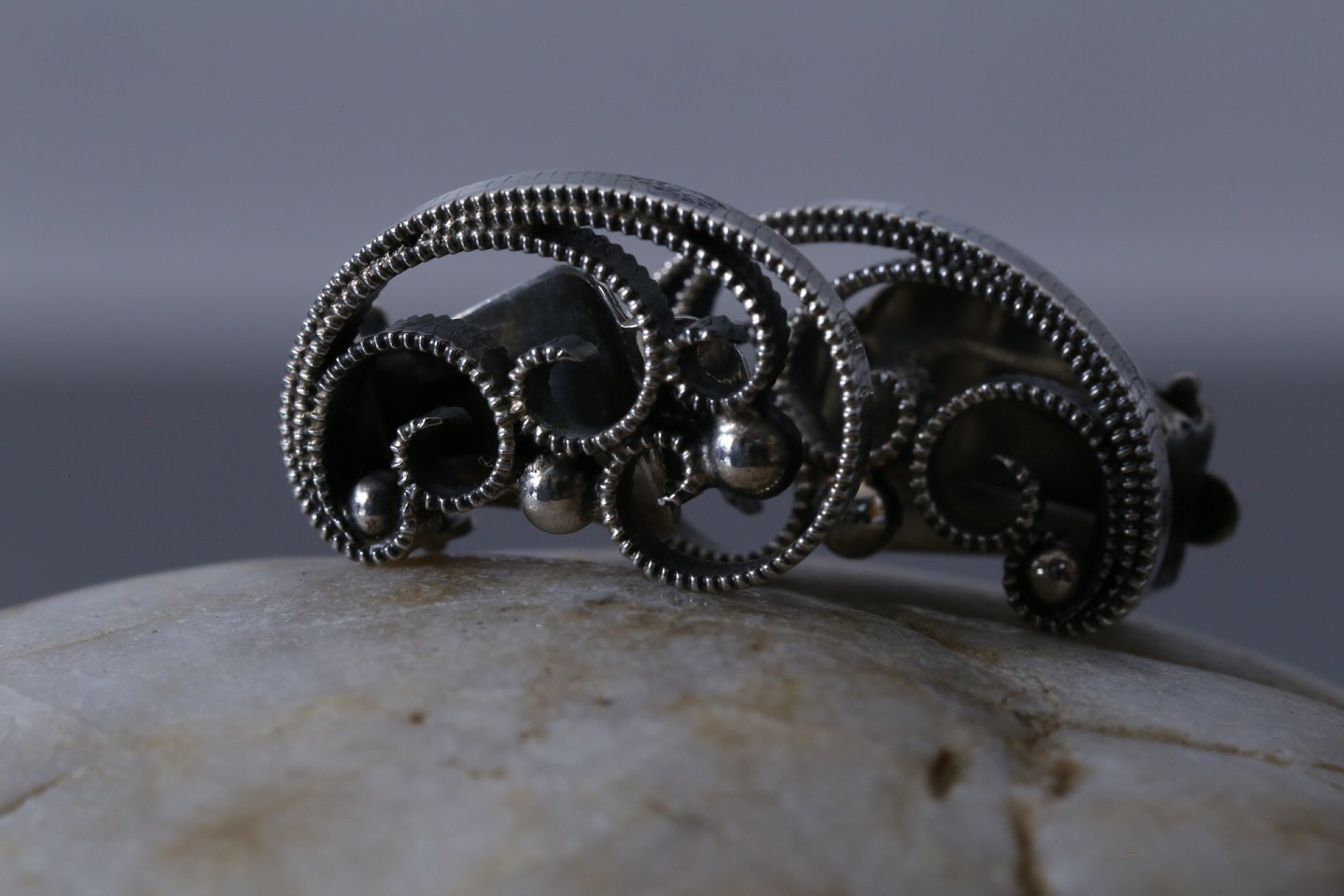 The curved shapes and small shiny silver balls give dynamism and life when worn. Can possibly be combined with this beautiful brooch: https://www.antikhuset.net/stort.asp?selbinr=558075