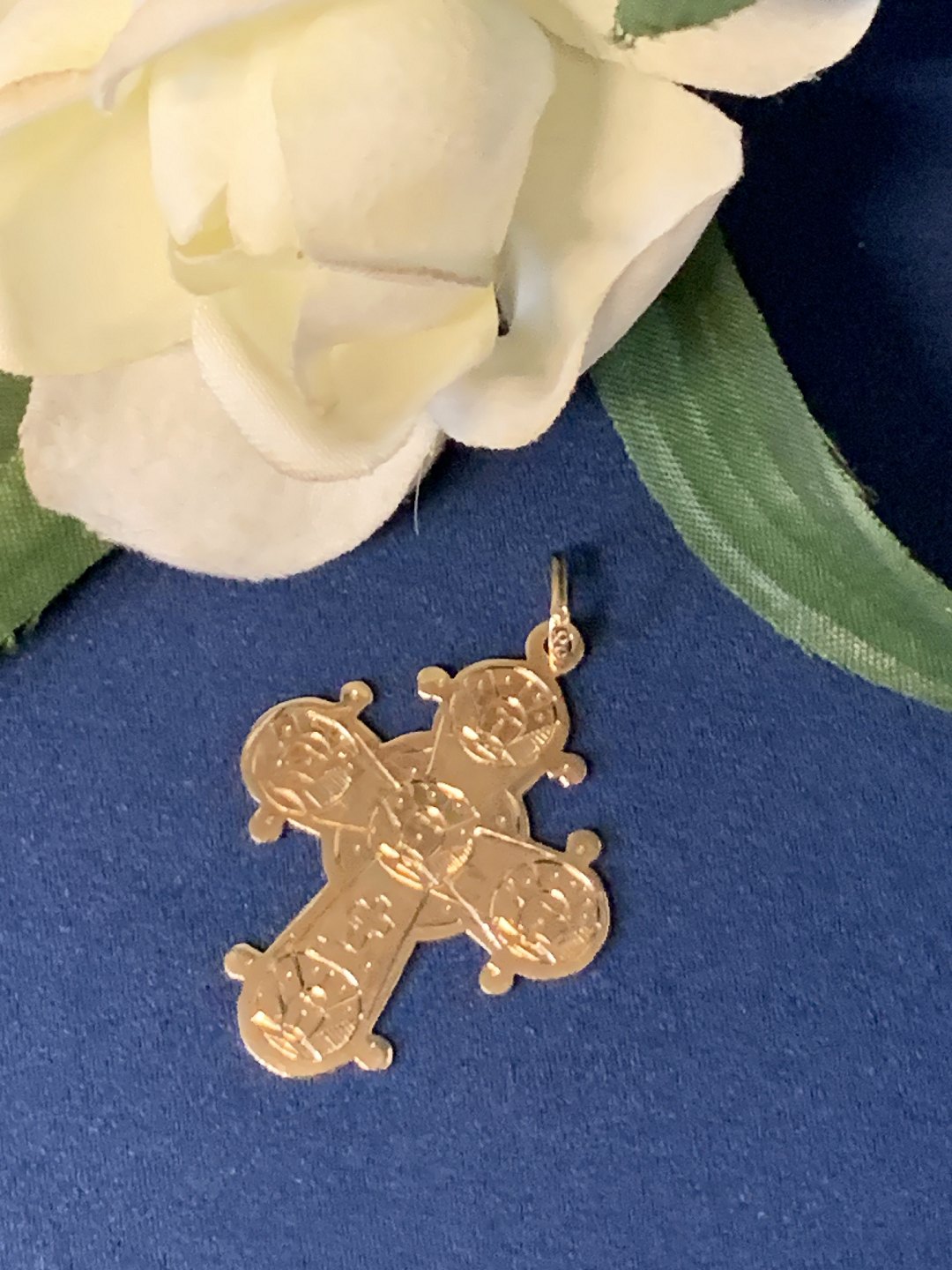 Smukt klassisk Dagmarkors i 14 karat guld, til halskæde. Dette Dagmarkors er lavet med fine detaljer, der gør korset til et smukt vedhæng der kan bæres hele livet. En oplagt gaveide til barnedåben eller konfirmationen.