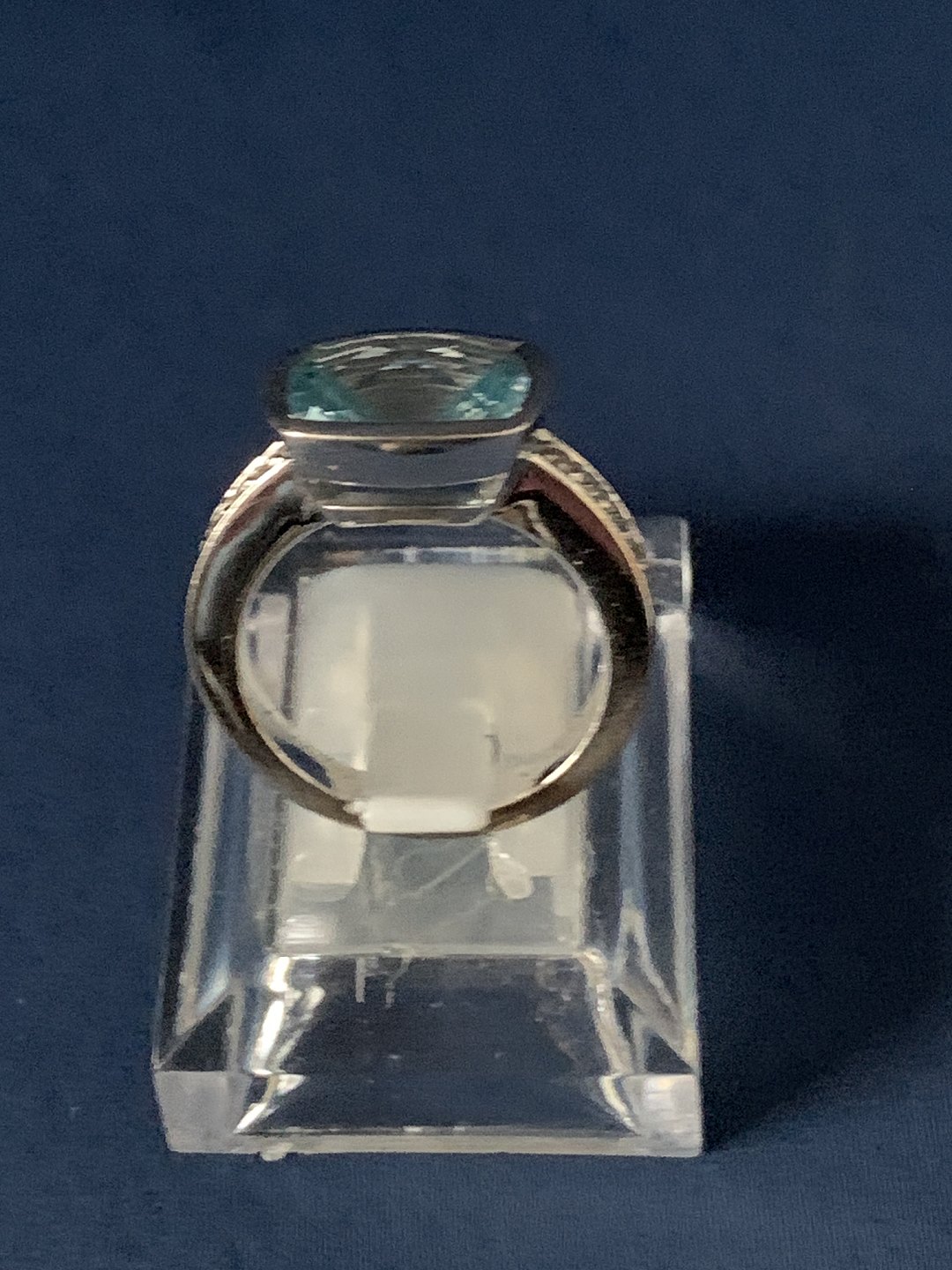 Flot og eksklusiv damering i 14 karat hvidguld, med flotte detaljer og stemplet 585 BØG. Ringen er fyldig på fingeren, og lavet med sans for det elegante. Ringen er besat med brillanter på den øverste runding, der ender i huset, hvori der er indlagt en flot blå tupas.