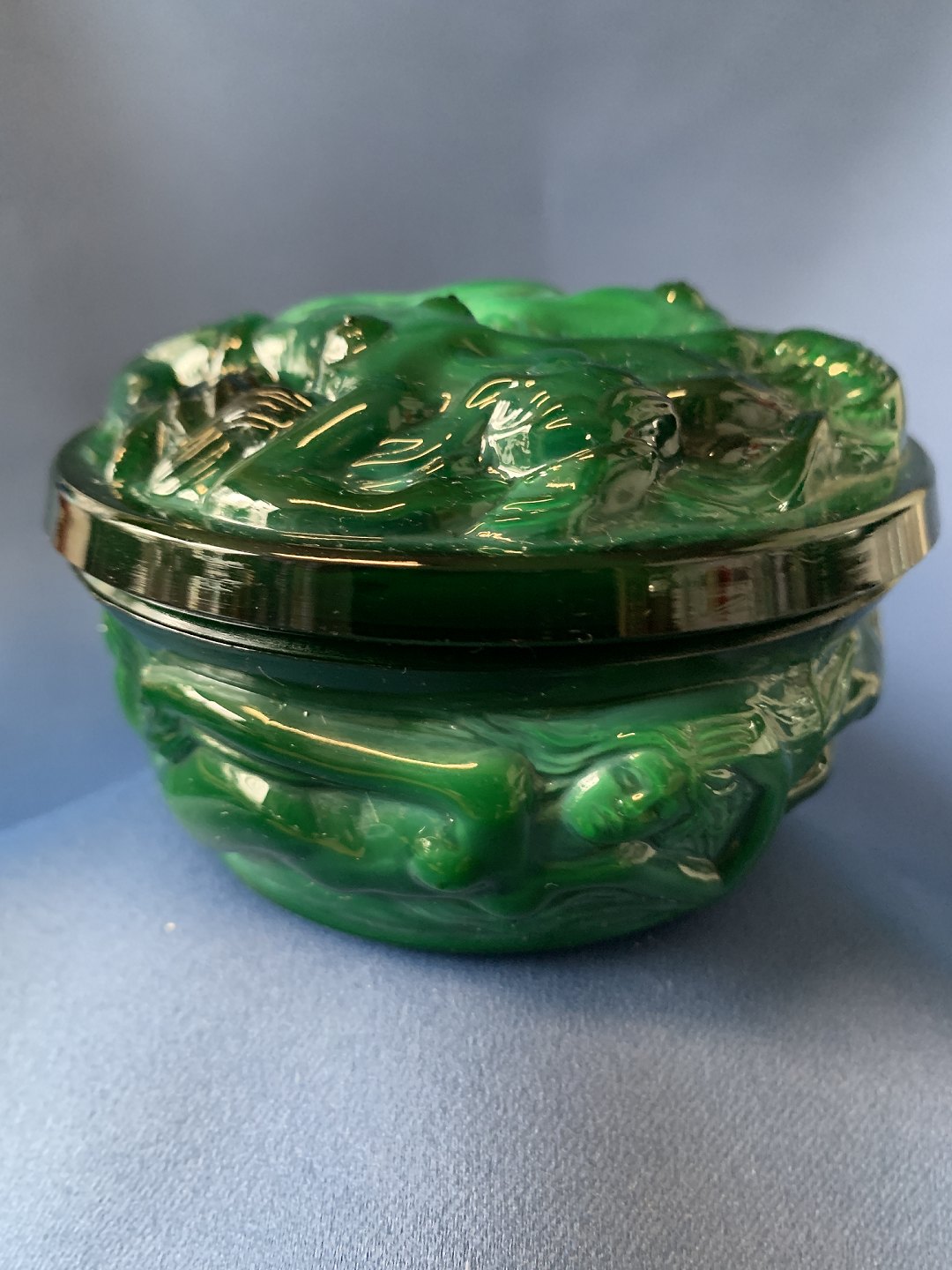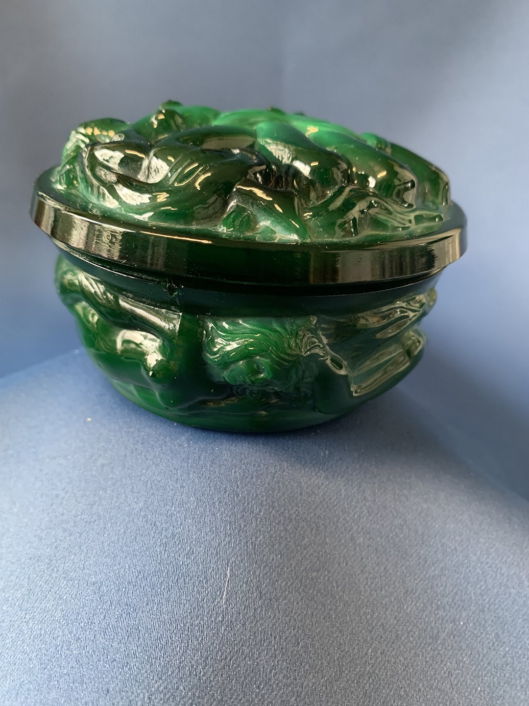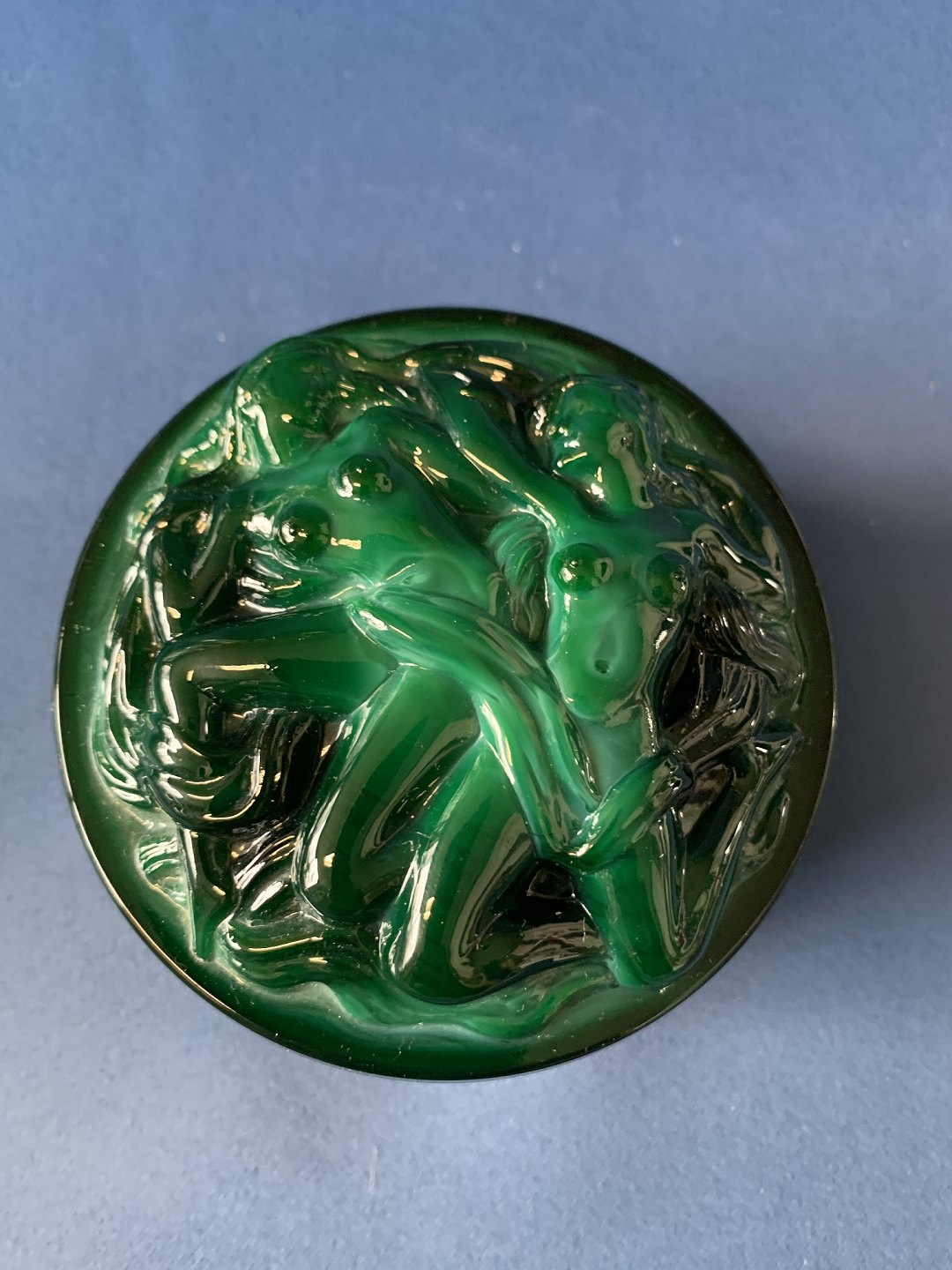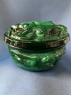 Round bowl with lid. Germany. Pressed green glass mass "malachite". Decorated with ladies. Dia.: 9.5 cm. Height: 6 cm.