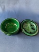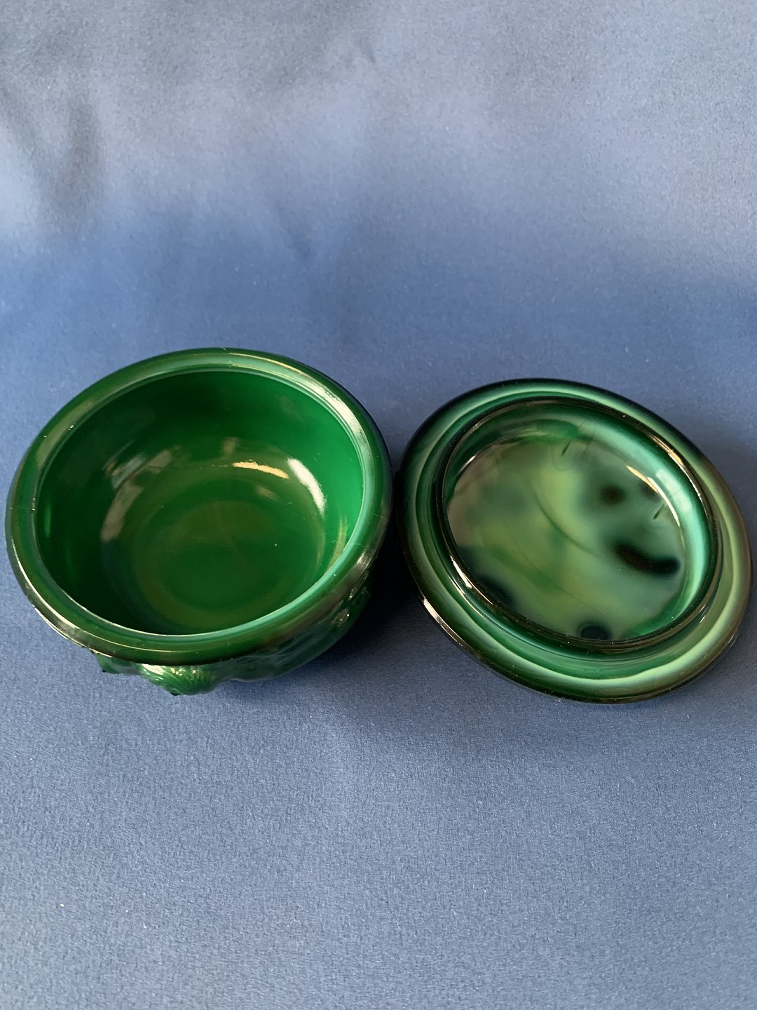 Round bowl with lid. Germany. Pressed green glass mass "malachite". Dia.: 9.5 cm. Height: 6 cm.