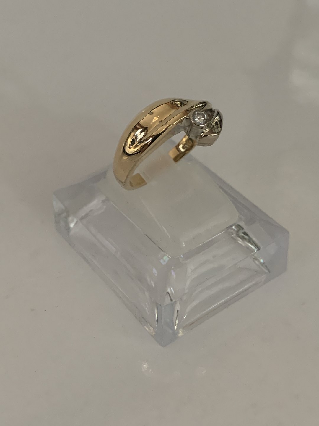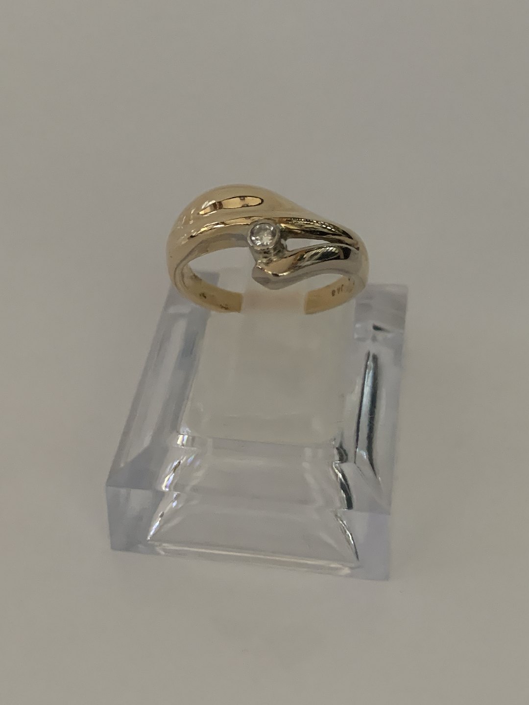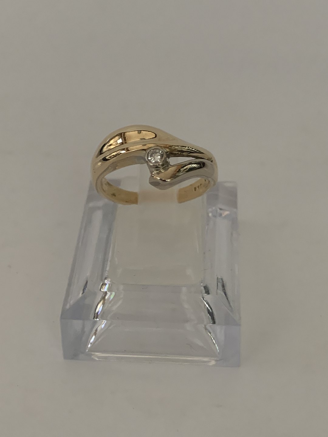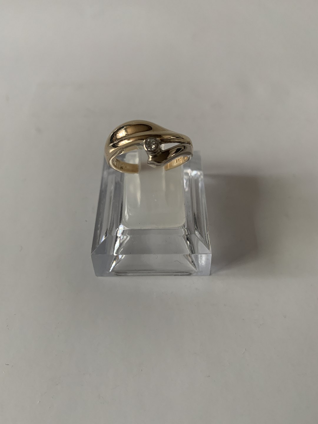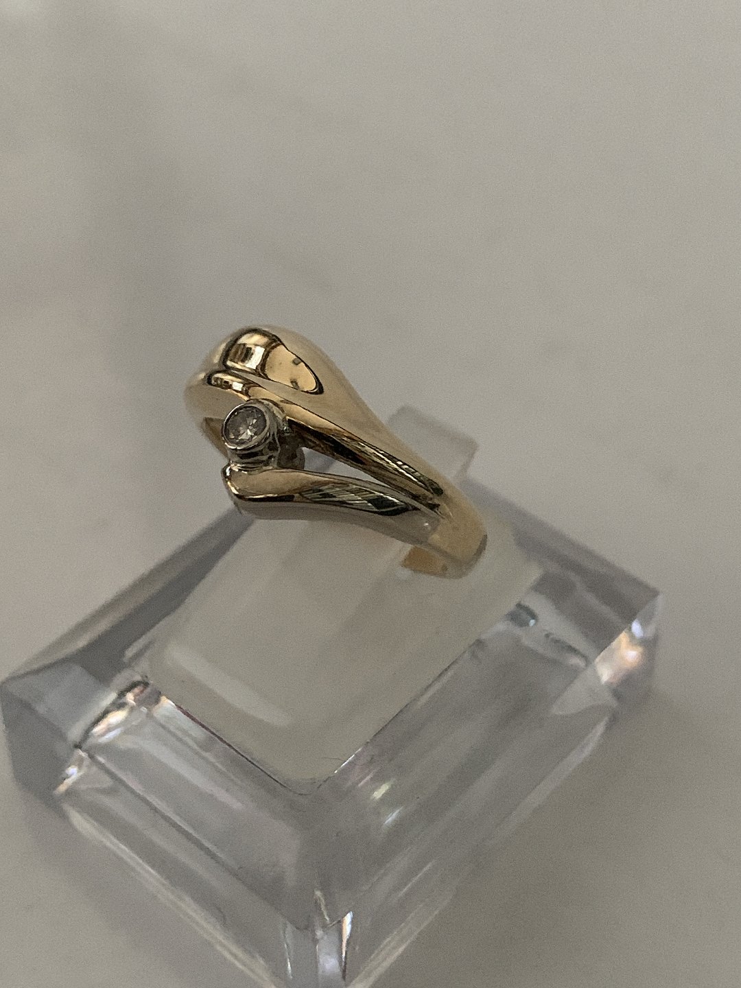 Smuk og elegant damering med smukt og spændende design. På toppen af ringen sidder en brillant, der giver ringen liv når lyses reflekteres. Ringen har flotte linjer, der henleder tanken på en blomst eller en spirende gren. Smuk ring, der kan bruges til både hverdag og festlige lejligheder.