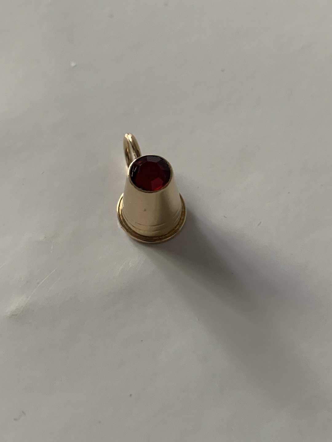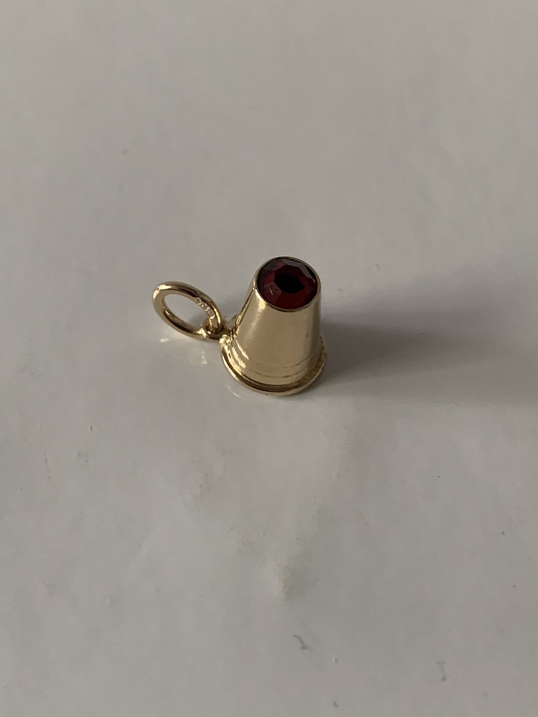 Fin lille charm , formet som fingerbøl og med indlagt rød sten. Dette lille charm er en fin lille detalje i et armbånd, hvor det kan indgå i en kombination med andre charms. Design dit eget unikke armbånd, og lav din egen stil.