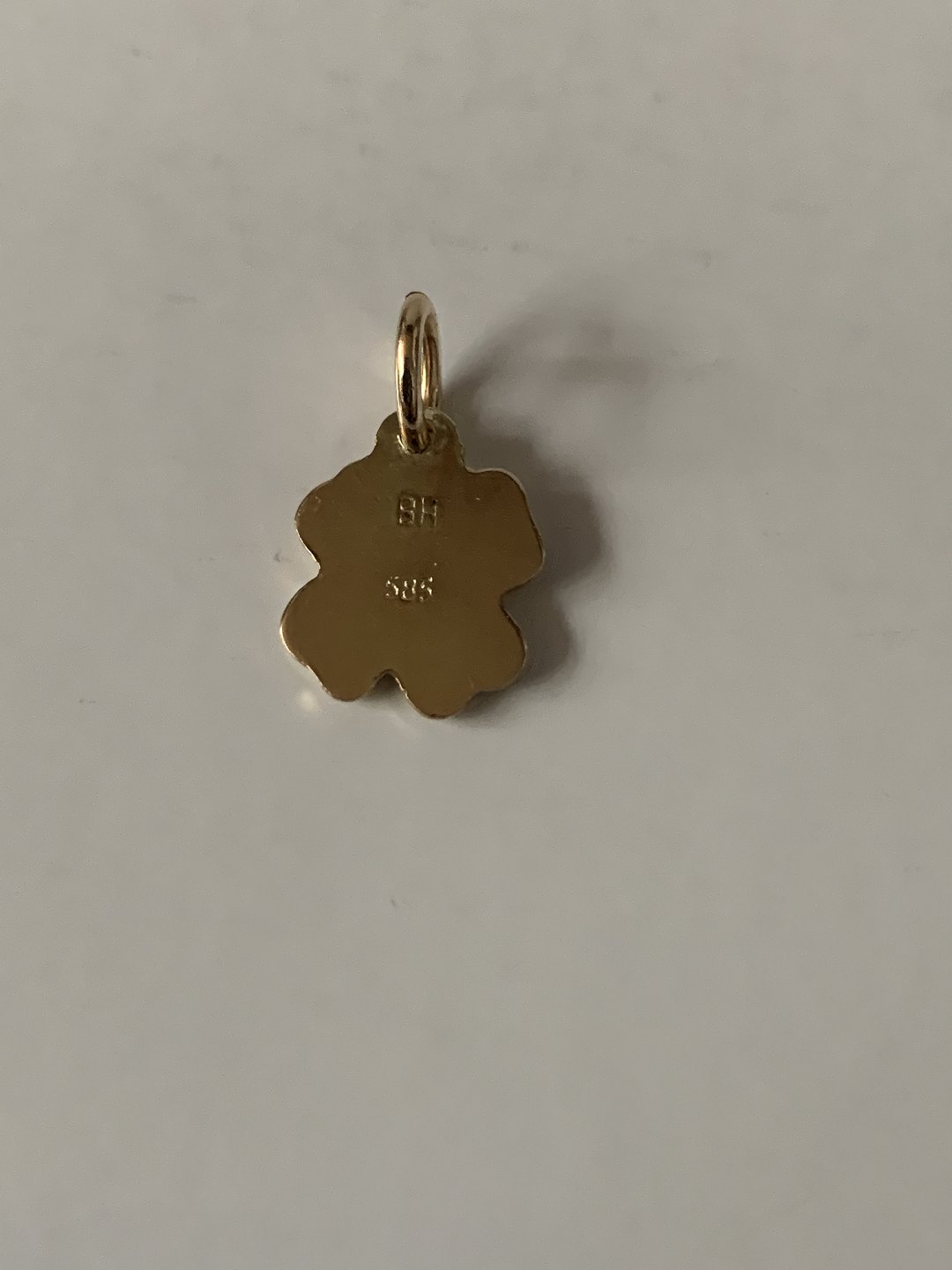 Vedhæng til armbånd eller halskæde, formet som firkløver i 14 karat guld. Det ikoniske symbol, firkløveren, er forbundet med held. Så måske bliver du badet i held, når du bærer denne firløver. Under alle omstændigheder, er det et fint lille vedhæng der vil komme til sin fulde ret enten i en tynd guldkæde om halsen, eller som charm i dit guldarmbånd.